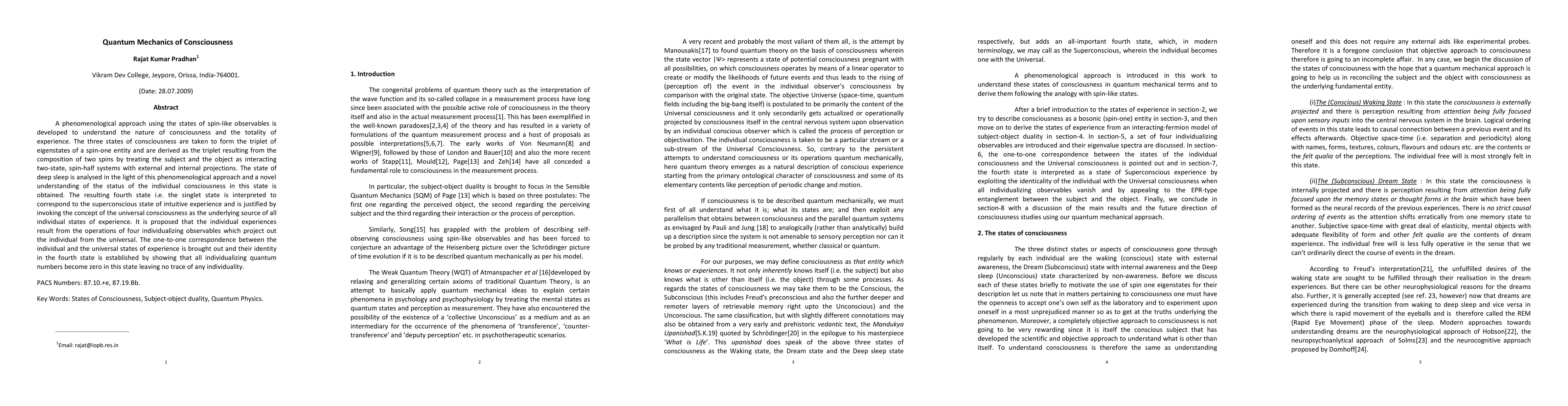 A phenomenological approach using the states of spin-like observables is developed to understand the nature of consciousness and the totality of experience. The three states of consciousness are taken to form the triplet of eigenstates of a spin-one entity and are derived as the triplet resulting from the composition of two spins by treating the subject and the object as interacting two-state, spin-half systems with external and internal projections. The state of deep sleep is analysed in the light of this phenomenological approach and a novel understanding of the status of the individual consciousness in this state is obtained. The resulting fourth state i.e. the singlet state is interpreted to correspond to the superconscious state of intuitive experience and is justified by invoking the concept of the universal consciousness as the underlying source of all individual states of experience. It is proposed that the individual experiences result from the operations of four individualizing observables which project out the individual from the universal. The one-to-one correspondence between the individual and the universal states of experience is brought out and their identity in the fourth state is established by showing that all individualizing quantum numbers become zero in this state leaving no trace of any individuality.