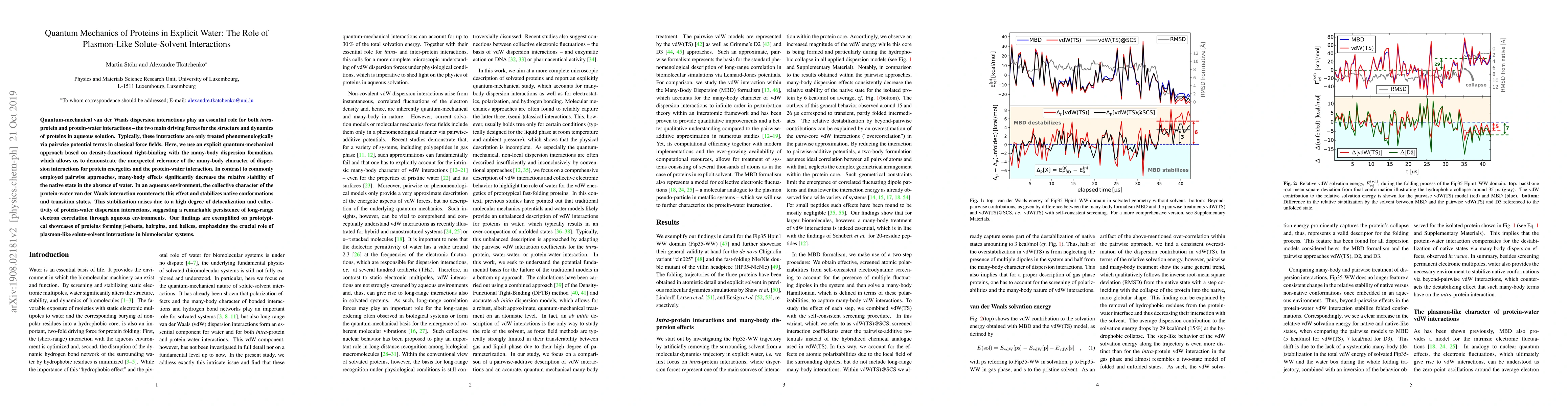 Quantum-mechanical van der Waals dispersion interactions play an essential role for both intra-protein and protein-water interactions -- the two main driving forces for the structure and dynamics of proteins in aqueous solution. Typically, these interactions are only treated phenomenologically via pairwise potential terms in classical force fields. Here, we use an explicit quantum-mechanical approach based on density-functional tight-binding with the many-body dispersion formalism, which allows us to demonstrate the unexpected relevance of the many-body character of dispersion interactions for protein energetics and the protein-water interaction. In contrast to commonly employed pairwise approaches, many-body effects significantly decrease the relative stability of the native state in the absence of water. In an aqueous environment, the collective character of the protein-water van der Waals interaction counteracts this effect and stabilizes native conformations and transition states. This stabilization arises due to a high degree of delocalization and collectivity of protein-water dispersion interactions, suggesting a remarkable persistence of long-range electron correlation through aqueous environments. Our findings are exemplified on prototypical showcases of proteins forming $\beta$-sheets, hairpins, and helices, emphasizing the crucial role of plasmon-like solute-solvent interactions in biomolecular systems.