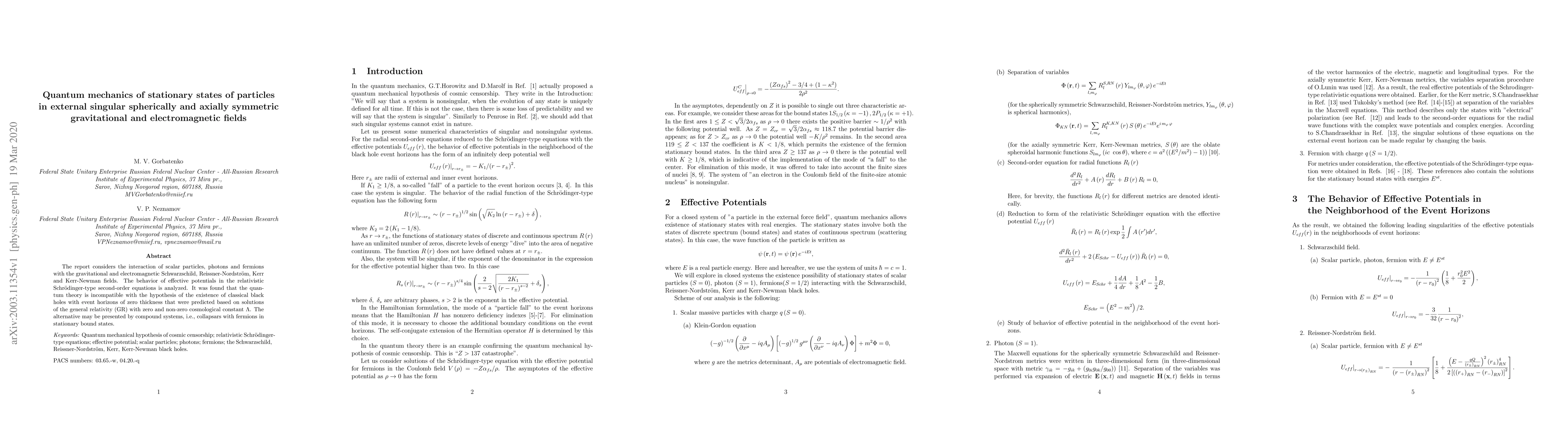 The report considers the interaction of scalar particles, photons and fermions with the gravitational and electromagnetic Schwarzschild, Reissner-Nordstr\"{o}m, Kerr and Kerr-Newman fields. The behavior of effective potentials in the relativistic Schr\"{o}dinger-type second-order equations is analyzed. It was found that the quantum theory is incompatible with the hypothesis of the existence of classical black holes with event horizons of zero thickness that were predicted based on solutions of the general relativity (GR) with zero and non-zero cosmological constant $\Lambda$. The alternative may be presented by compound systems, i.e., collapsars with fermions in stationary bound states.