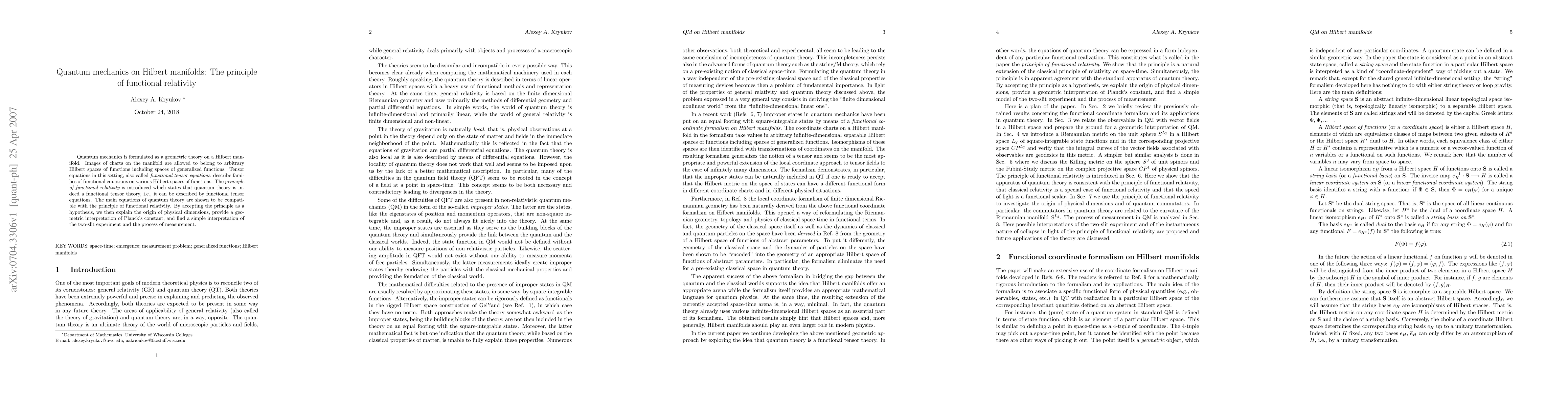 This paper formulates quantum mechanics on a Hilbert manifold, allowing for tensor equations that describe functional equations across various Hilbert spaces. It introduces the principle of functional relativity, asserting that quantum theory can be described by functional tensor equations, and analyzes its implications for physical dimensions, Planck's constant, and interpretations of experiments like the two-slit experiment.