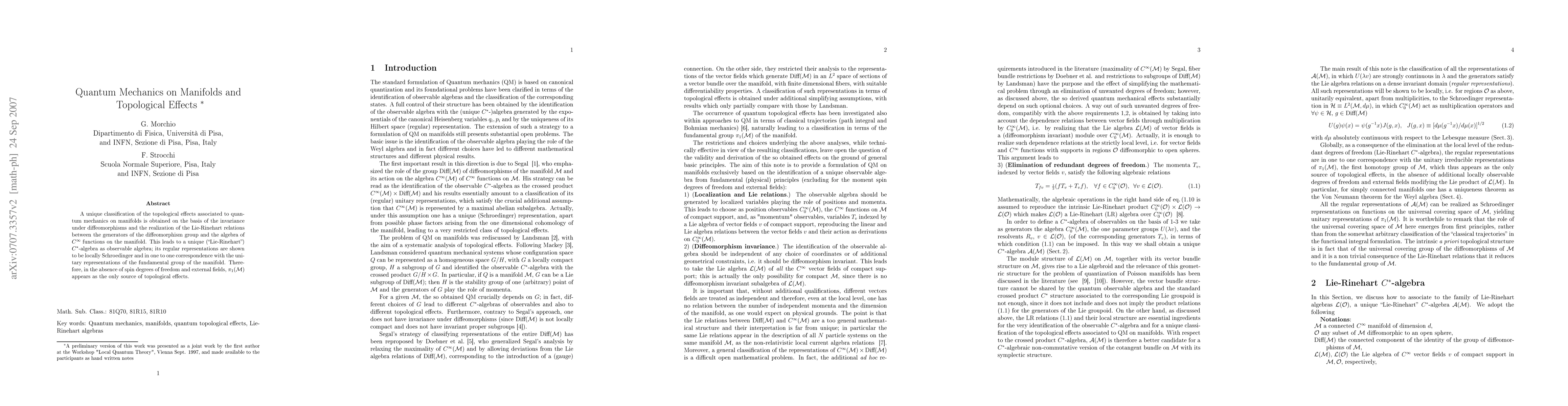 Research finds that quantum mechanics on manifolds is classified based on invariance under diffeomorphisms, leading to a unique C* algebra as the observable algebra, which reveals the fundamental group of the manifold as the source of topological effects.