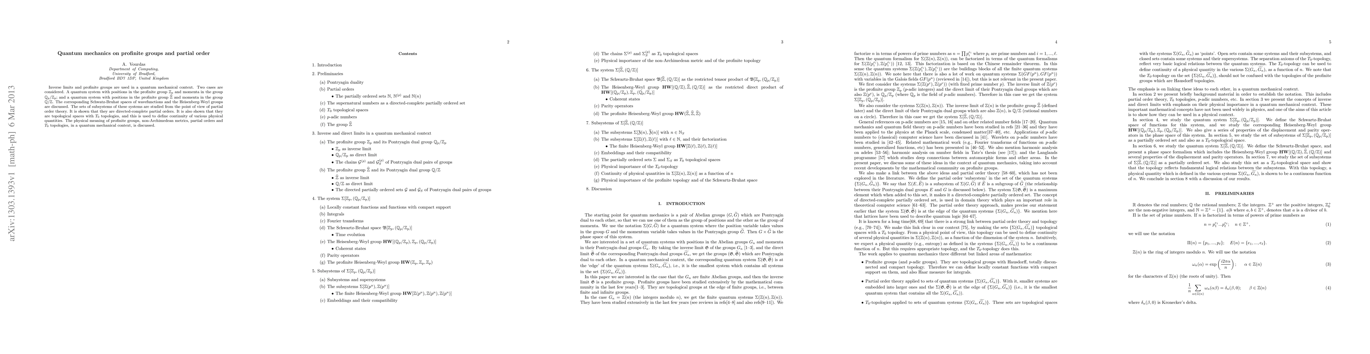 Inverse limits and profinite groups are used in a quantum mechanical context. Two cases are considered. A quantum system with positions in the profinite group ${\mathbb Z}_p$ and momenta in the group ${\mathbb Q}_p/{\mathbb Z}_p$; and a quantum system with positions in the profinite group ${\hat {\mathbb Z}}$ and momenta in the group ${\mathbb Q}/{\mathbb Z}$. The corresponding Schwatz-Bruhat spaces of wavefunctions and the Heisenberg-Weyl groups are discussed. The sets of subsystems of these systems are studied from the point of view of partial order theory. It is shown that they are directed-complete partial orders. It is also shown that they are topological spaces with $T_0$ topologies, and this is used to define continuity of various physical quantities. The physical meaning of profinite groups, non-Archimedean metrics, partial orders and $T_0$ topologies, in a quantum mechanical context, is discussed.