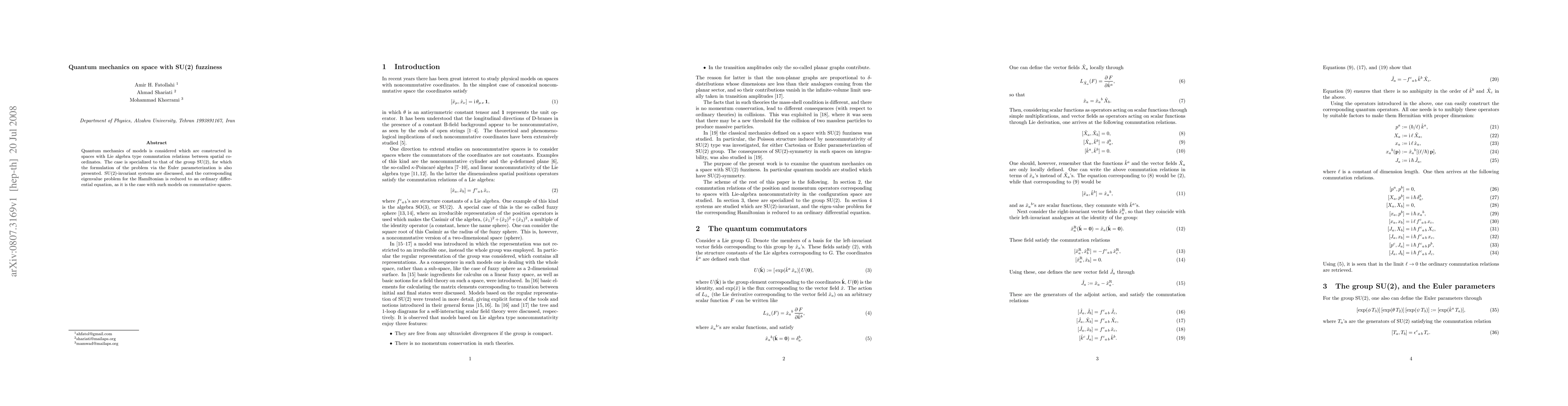 Quantum mechanics of models is considered which are constructed in spaces with Lie algebra type commutation relations between spatial coordinates. The case is specialized to that of the group SU(2), for which the formulation of the problem via the Euler parameterization is also presented. SU(2)-invariant systems are discussed, and the corresponding eigenvalue problem for the Hamiltonian is reduced to an ordinary differential equation, as it is the case with such models on commutative spaces.