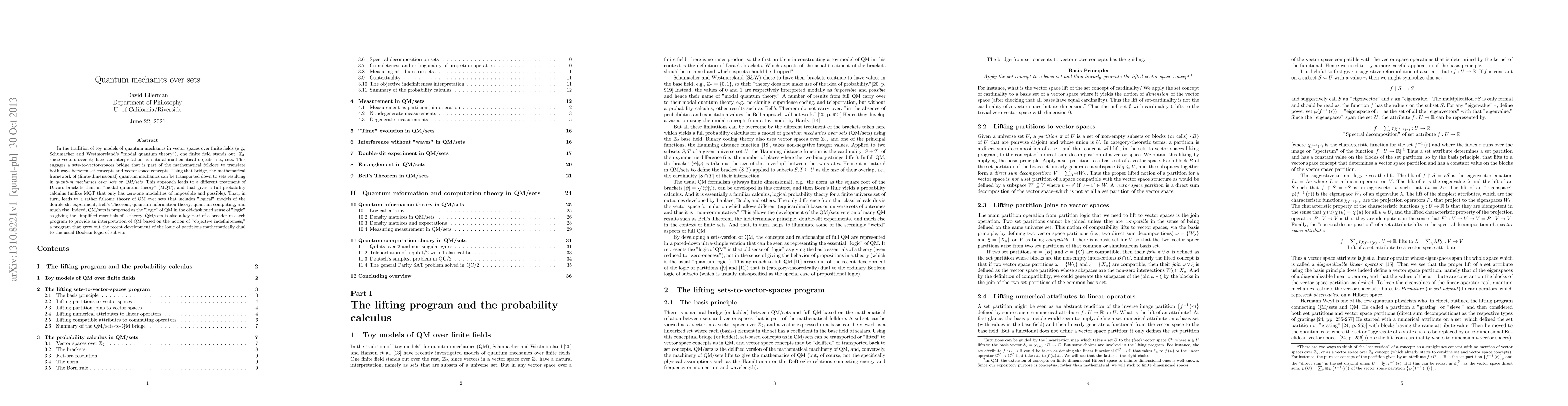 In the tradition of toy models of quantum mechanics in vector spaces over finite fields (e.g., Schumacher and Westmoreland's "modal quantum theory"), one finite field stands out, 2, since vectors over 2 have an interpretation as natural mathematical objects, i.e., sets. This engages a sets-to-vector-spaces bridge that is part of the mathematical folklore to translate both ways between set concepts and vector space concepts. Using that bridge, the mathematical framework of (finite-dimensional) quantum mechanics can be transported down to sets resulting in quantum mechanics over sets or QM/sets. This approach leads to a different treatment of Dirac's brackets than in "modal quantum theory" (MQT), and that gives a full probability calculus (unlike MQT that only has zero-one modalities of impossible and possible). That, in turn, leads to a rather fulsome theory of QM over sets that includes "logical" models of the double-slit experiment, Bell's Theorem, quantum information theory, quantum computing, and much else. Indeed, QM/sets is proposed as the "logic" of QM in the old-fashioned sense of "logic" as giving the simplified essentials of a theory. QM/sets is also a key part of a broader research program to provide an interpretation of QM based on the notion of "objective indefiniteness," a program that grew out the recent development of the logic of partitions mathematically dual to the usual Boolean logic of subsets.