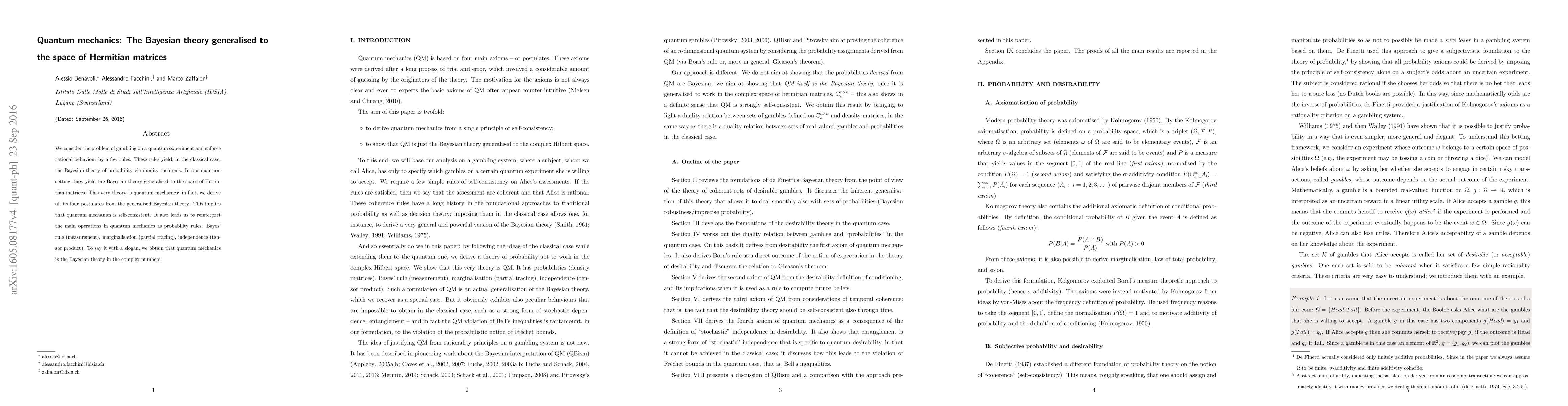 We consider the problem of gambling on a quantum experiment and enforce rational behaviour by a few rules. These rules yield, in the classical case, the Bayesian theory of probability via duality theorems. In our quantum setting, they yield the Bayesian theory generalised to the space of Hermitian matrices. This very theory is quantum mechanics: in fact, we derive all its four postulates from the generalised Bayesian theory. This implies that quantum mechanics is self-consistent. It also leads us to reinterpret the main operations in quantum mechanics as probability rules: Bayes' rule (measurement), marginalisation (partial tracing), independence (tensor product). To say it with a slogan, we obtain that quantum mechanics is the Bayesian theory in the complex numbers.