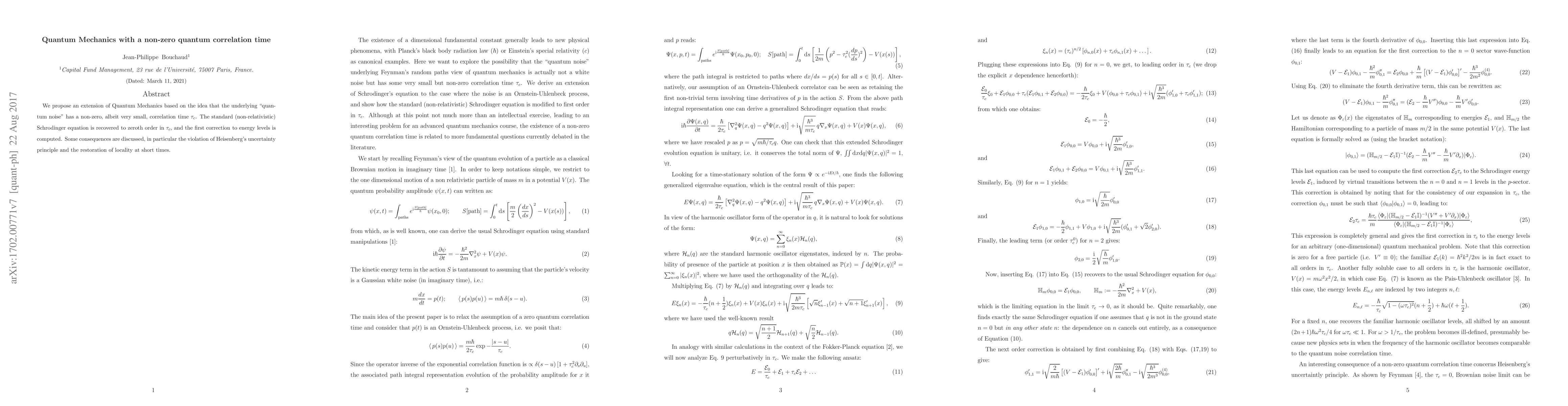 This paper extends Quantum Mechanics by introducing a non-zero quantum correlation time $\tau_c$, proposing that "quantum noise" has a small correlation time. The standard Schrödinger equation is retained at first order in $\tau_c$, while the first correction to energy levels is calculated, leading to the violation of Heisenberg's uncertainty principle and the restoration of locality at short times.