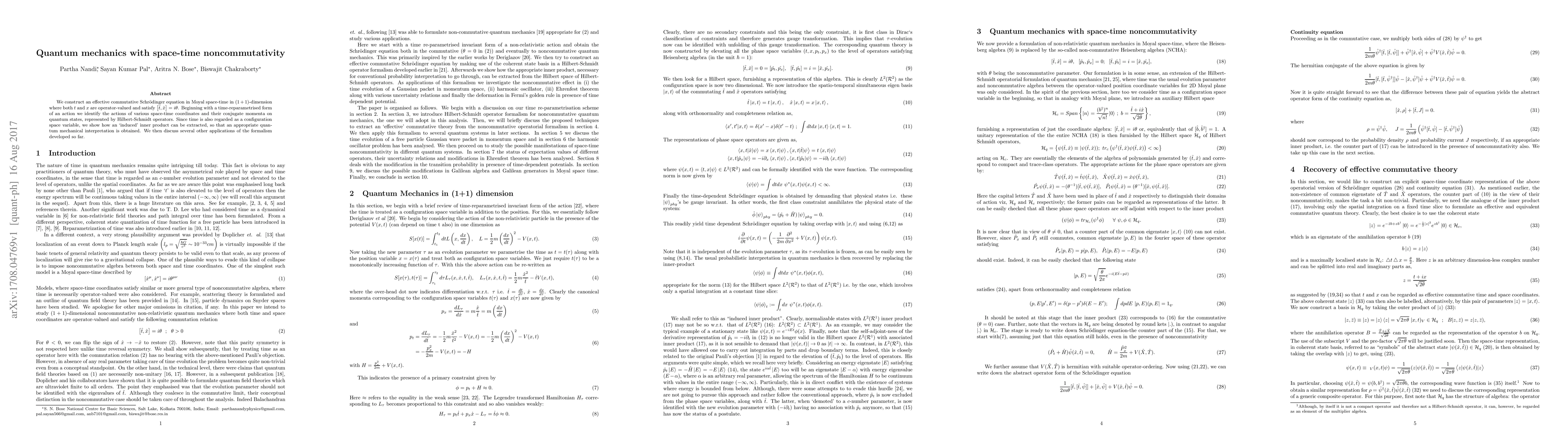 We construct an effective commutative Schr\"odinger equation in Moyal space-time in $(1+1)$-dimension where both $t$ and $x$ are operator-valued and satisfy $\left[ \hat{t}, \hat{x} \right] = i \theta$. Beginning with a time-reparametrised form of an action we identify the actions of various space-time coordinates and their conjugate momenta on quantum states, represented by Hilbert-Schmidt operators. Since time is also regarded as a configuration space variable, we show how an `induced' inner product can be extracted, so that an appropriate quantum mechanical interpretation is obtained. We then discuss several other applications of the formalism developed so far.