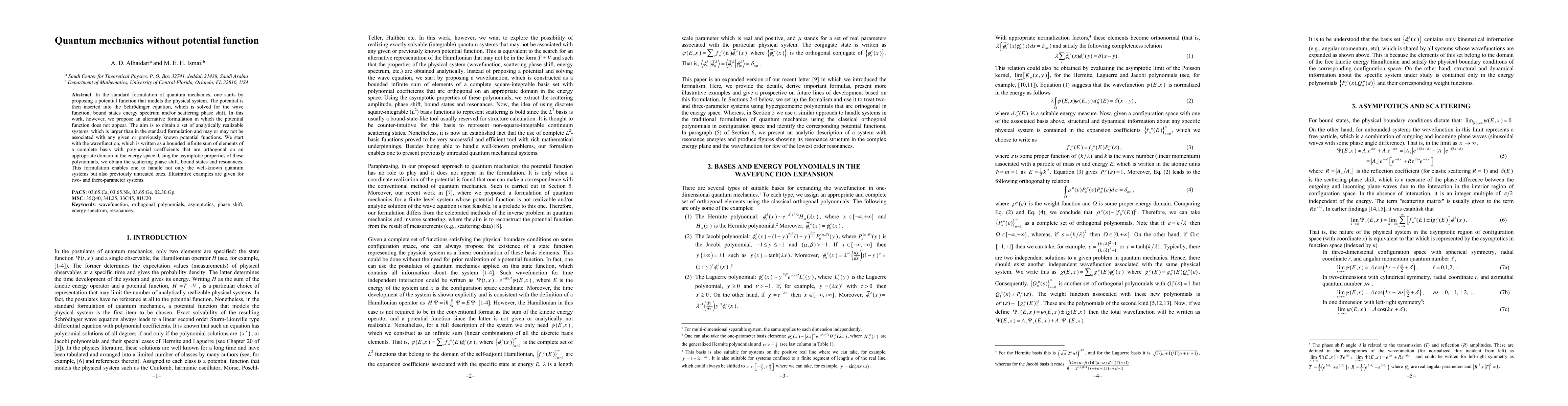 In the standard formulation of quantum mechanics, one starts by proposing a potential function that models the physical system. The potential is then inserted into the Schr\"odinger equation, which is solved for the wave function, bound states energy spectrum and/or scattering phase shift. In this work, however, we propose an alternative formulation in which the potential function does not appear. The aim is to obtain a set of analytically realizable systems, which is larger than in the standard formulation and may or may not be associated with any given or previously known potential functions. We start with the wavefunction, which is written as a bounded infinite sum of elements of a complete basis with polynomial coefficients that are orthogonal on an appropriate domain in the energy space. Using the asymptotic properties of these polynomials, we obtain the scattering phase shift, bound states and resonances. This formulation enables one to handle not only the well-known quantum systems but also previously untreated ones. Illustrative examples are given for two- and there-parameter systems.