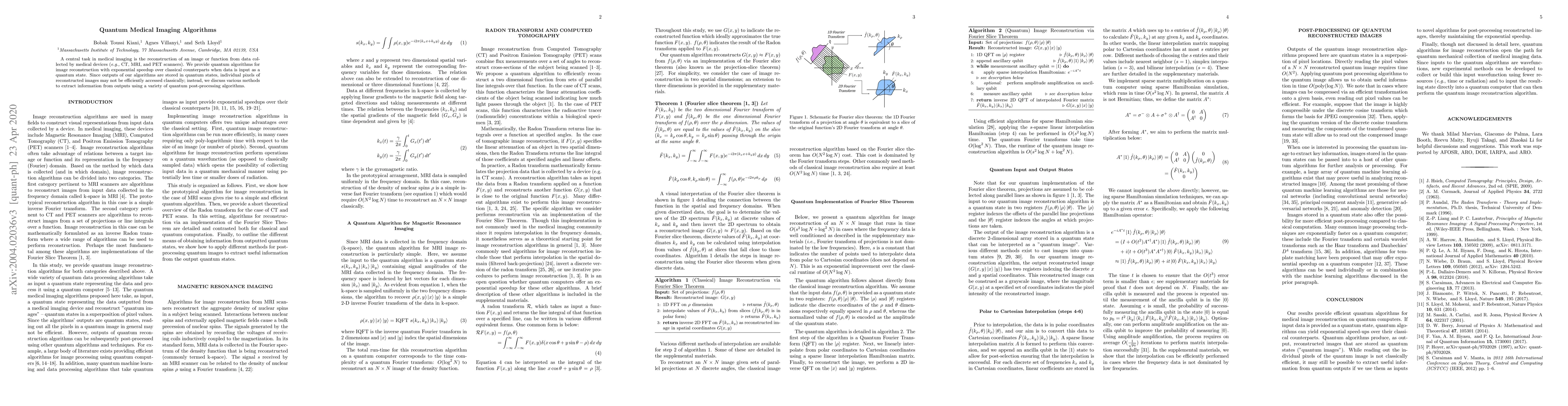 This paper presents quantum algorithms that offer exponential speedup for image reconstruction in medical imaging, allowing for faster processing of complex medical data. The findings provide a new approach to medical imaging, enabling more efficient analysis and storage of quantum-state outputs.
