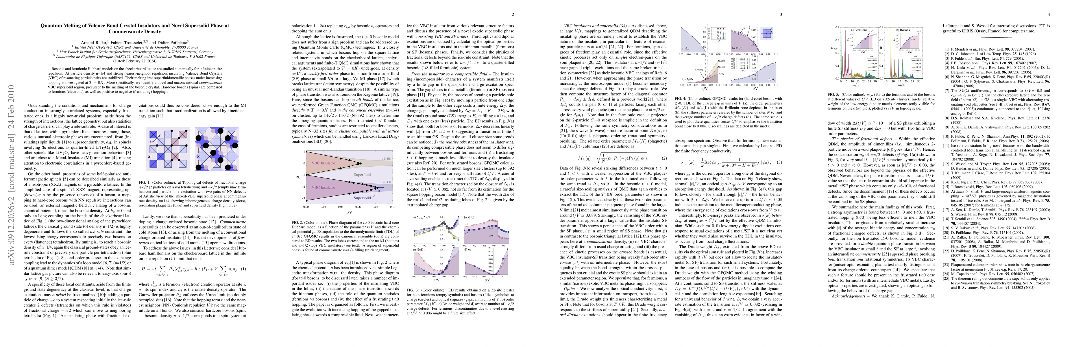 Bosonic and fermionic Hubbard models on the checkerboard lattice are studied numerically for infinite on-site repulsion. At particle density n=1/4 and strong nearest-neighbor repulsion, insulating Valence Bond Crystals (VBC) of resonating particle pairs are stabilized. Their melting into superfluid/metallic phases under increasing hopping is investigated at T=0K. More specifically, we identify a novel and unconventional commensurate VBC supersolid region, precursor to the melting of the bosonic crystal. Hardcore bosons (spins) are compared to fermions (electrons), as well as positive to negative (frustrating) hoppings.
