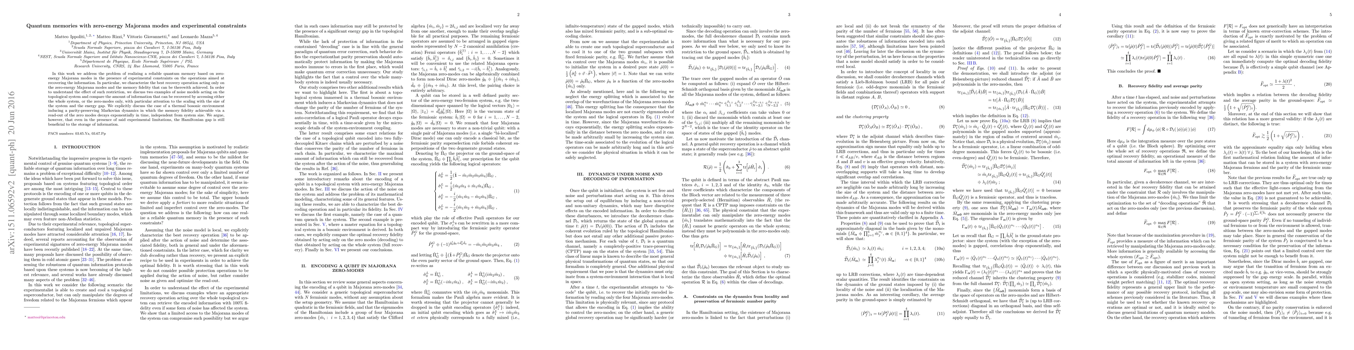 This paper explores the feasibility of quantum memories utilizing zero-energy Majorana modes under experimental constraints, identifying optimal recovery operations and analyzing memory fidelity. It concludes that while limitations prevent full recovery, the Hamiltonian gap still aids in information storage.