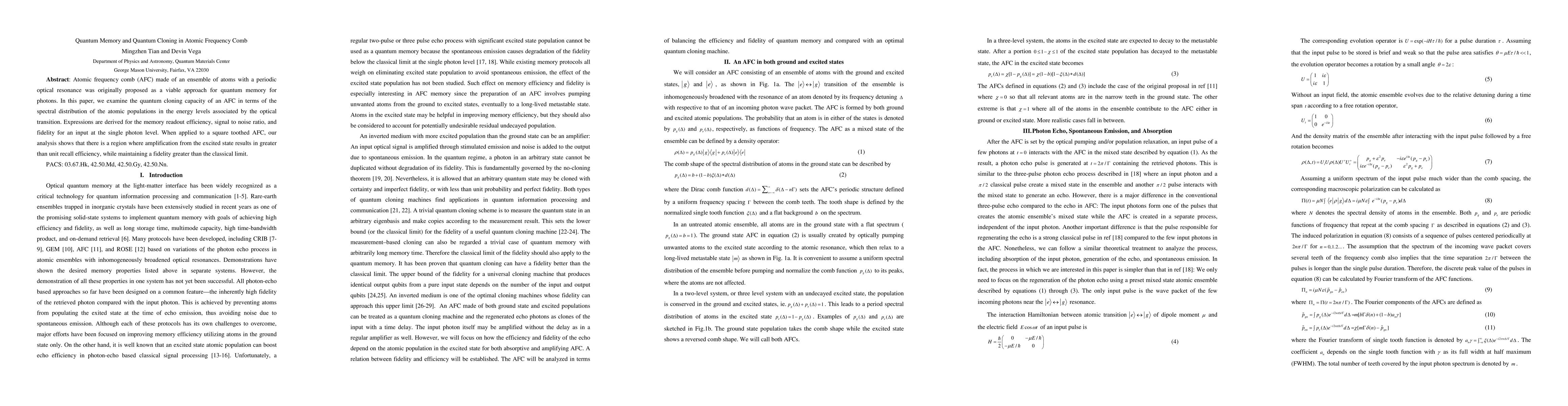 Atomic frequency comb (AFC) made of an ensemble of atoms with a periodic optical resonance was originally proposed as a viable approach for quantum memory for photons. In this paper, we examine the quantum cloning capacity of an AFC in terms of the spectral distribution of the atomic populations in the energy levels associated by the optical transition. Expressions are derived for the memory readout efficiency, signal to noise ratio, and fidelity for an input at the single photon level. When applied to a square toothed AFC, our analysis shows that there is a region where amplification from the excited state results in greater than unit recall efficiency, while maintaining a fidelity greater than the classical limit.