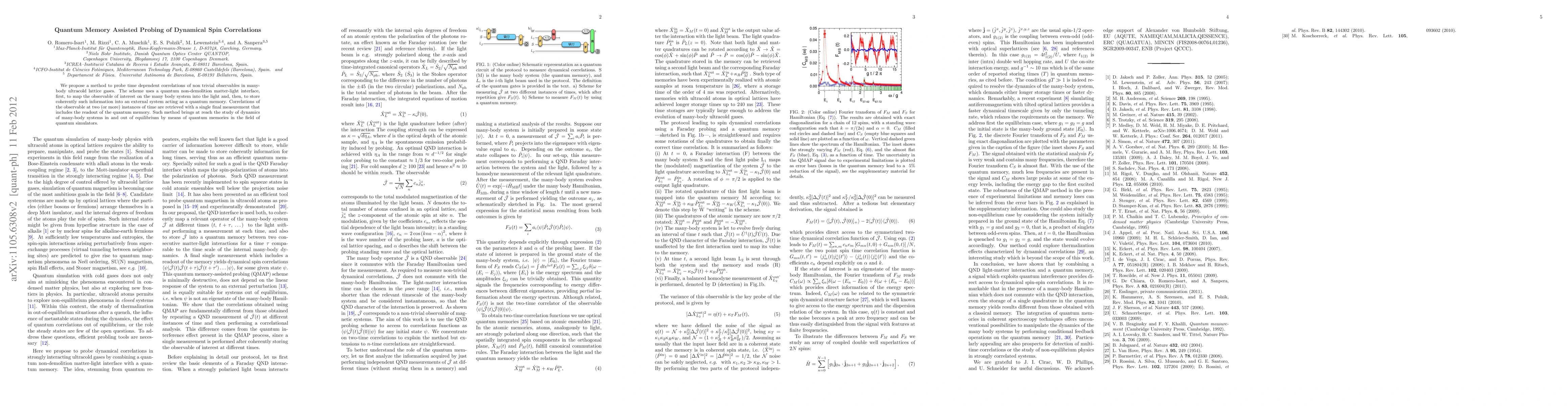 We propose a method to probe time dependent correlations of non trivial observables in many-body ultracold lattice gases. The scheme uses a quantum non-demolition matter-light interface, first, to map the observable of interest on the many body system into the light and, then, to store coherently such information into an external system acting as a quantum memory. Correlations of the observable at two (or more) instances of time are retrieved with a single final measurement that includes the readout of the quantum memory. Such method brings at reach the study of dynamics of many-body systems in and out of equilibrium by means of quantum memories in the field of quantum simulators.