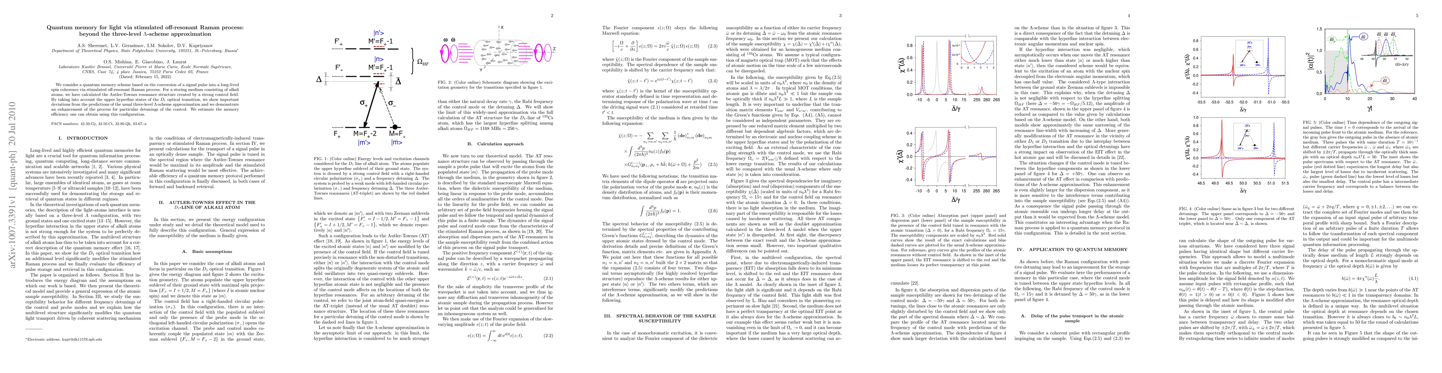 This paper proposes a quantum memory scheme for light using a stimulated off-resonant Raman process in alkali atoms, revealing significant deviations from the traditional three-level Lambda-scheme approximation due to upper hyperfine states, and demonstrates enhanced memory efficiency under specific control detunings.