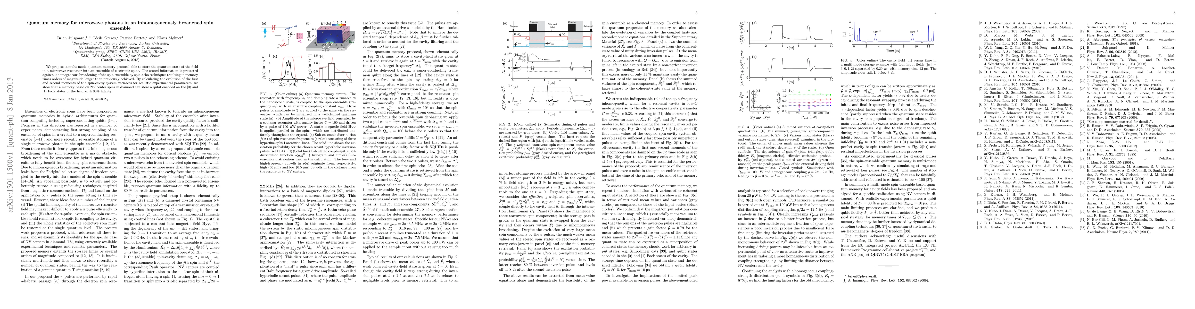This paper proposes a quantum memory protocol to store microwave photon states in an ensemble of electronic spins, using NV center spins in diamond. The protocol employs spin-echo techniques to counteract inhomogeneous broadening, achieving memory times significantly longer than previous methods and demonstrating 80% fidelity for qubit storage.