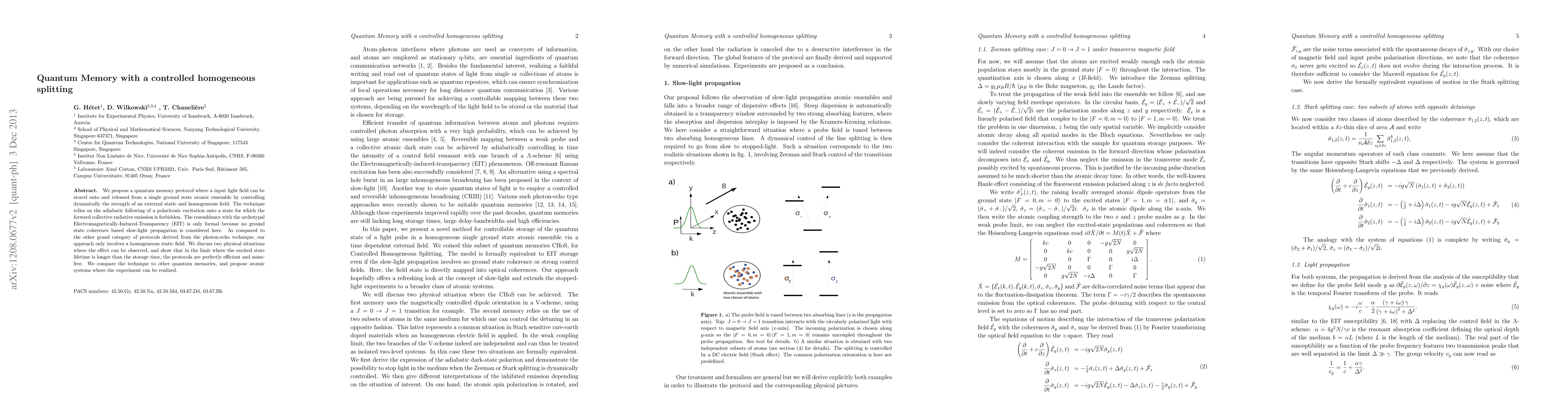 We propose a quantum memory protocol where a input light field can be stored onto and released from a single ground state atomic ensemble by controlling dynamically the strength of an external static and homogeneous field. The technique relies on the adiabatic following of a polaritonic excitation onto a state for which the forward collective radiative emission is forbidden. The resemblance with the archetypal Electromagnetically-Induced-Transparency (EIT) is only formal because no ground state coherence based slow-light propagation is considered here. As compared to the other grand category of protocols derived from the photon-echo technique, our approach only involves a homogeneous static field. We discuss two physical situations where the effect can be observed, and show that in the limit where the excited state lifetime is longer than the storage time, the protocols are perfectly efficient and noise-free. We compare the technique to other quantum memories, and propose atomic systems where the experiment can be realized.