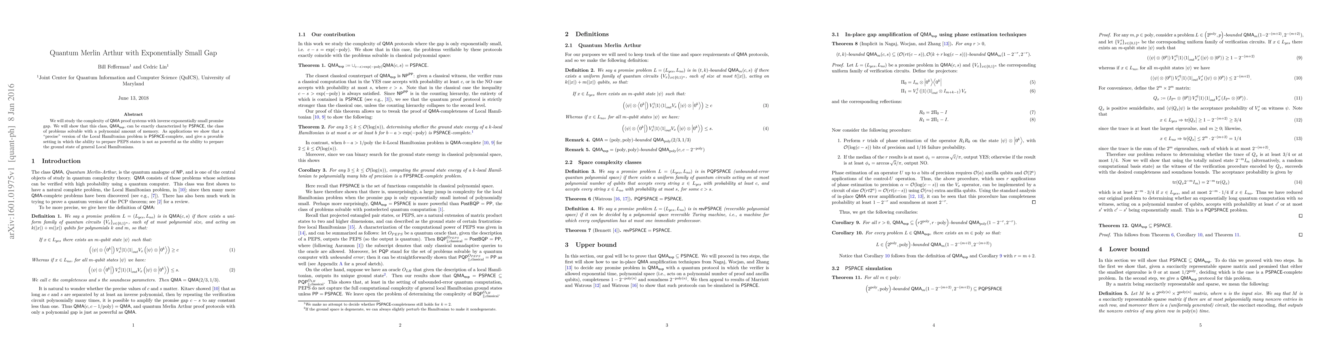 We study the complexity of QMA proof systems with inverse exponentially small promise gap. We show that this class can be exactly characterized by PSPACE, the class of problems solvable with a polynomial amount of memory. As applications we show that a "precise" version of the Local Hamiltonian problem is PSPACE-complete, and give a provable setting in which the ability to prepare PEPS states is not as powerful as the ability to prepare the ground state of general Local Hamiltonians.