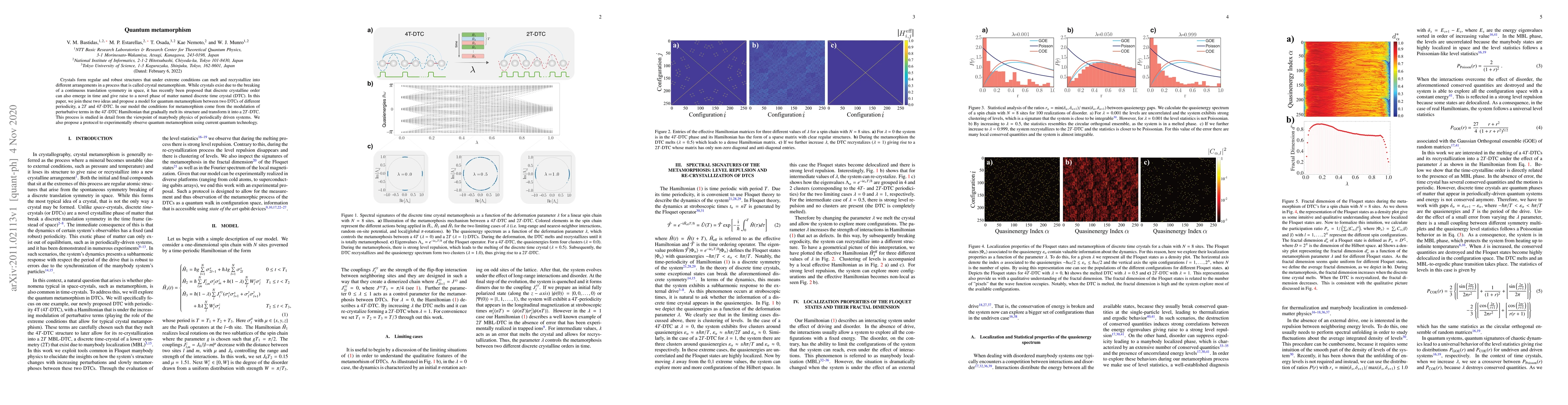 Crystals form regular and robust structures that under extreme conditions can melt and recrystallize into different arrangements in a process that is called crystal metamorphism. While crystals exist due to the breaking of a continuous translation symmetry in space, it has recently been proposed that discrete crystalline order can also emerge in time and give raise to a novel phase of matter named discrete time crystal (DTC). In this paper, we join these two ideas and propose a model for quantum metamorphism between two DTCs of different periodicity, a 2T and 4T-DTC. In our model the conditions for metamorphism come from the modulation of perturbative terms in the 4T-DTC Hamiltonian that gradually melt its structure and transform it into a 2T-DTC. This process is studied in detail from the viewpoint of manybody physics of periodically driven systems. We also propose a protocol to experimentally observe quantum metamorphism using current quantum technology.