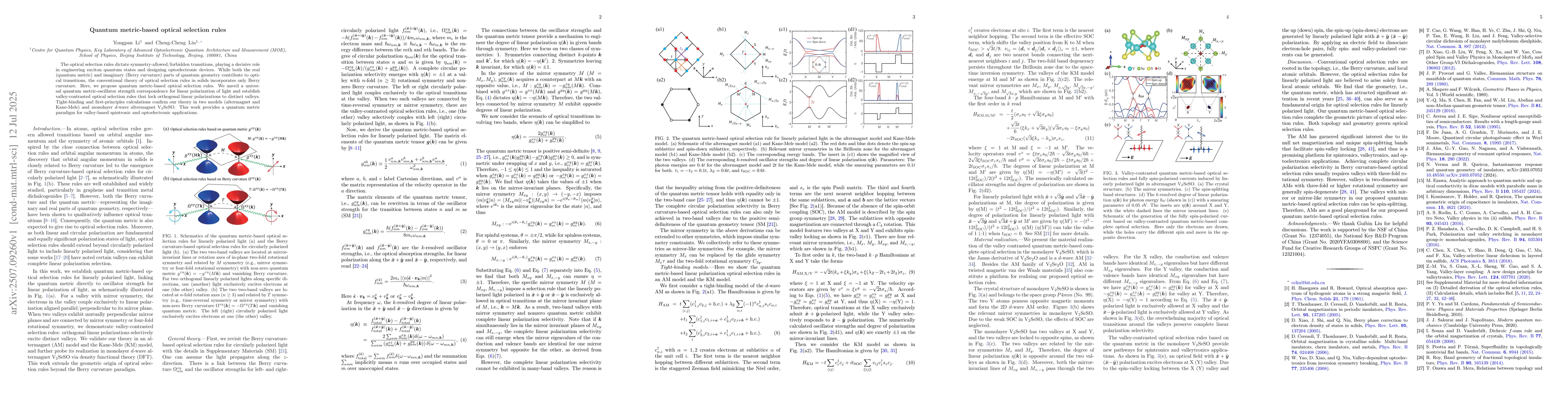 The optical selection rules dictate symmetry-allowed/forbidden transitions, playing a decisive role in engineering exciton quantum states and designing optoelectronic devices. While both the real (quantum metric) and imaginary (Berry curvature) parts of quantum geometry contribute to optical transitions, the conventional theory of optical selection rules in solids incorporates only Berry curvature. Here, we propose quantum metric-based optical selection rules. We unveil a universal quantum metric-oscillator strength correspondence for linear polarization of light and establish valley-contrasted optical selection rules that lock orthogonal linear polarizations to distinct valleys. Tight-binding and first-principles calculations confirm our theory in two models (altermagnet and Kane-Mele) and monolayer $d$-wave altermagnet $\mathrm{V_2SeSO}$. This work provides a quantum metric paradigm for valley-based spintronic and optoelectronic applications.