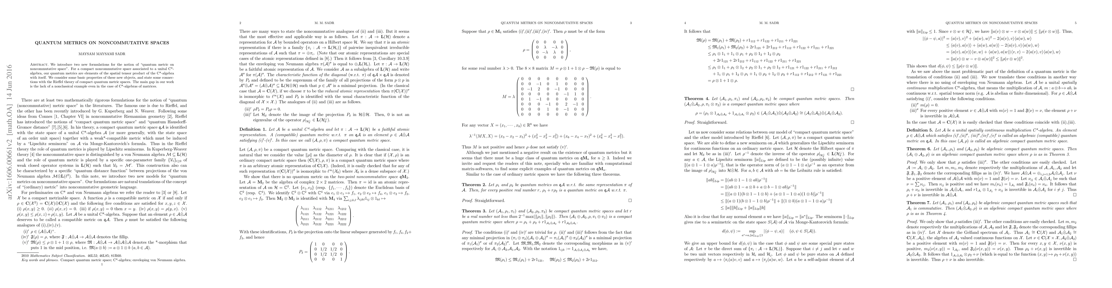 We introduce two new formulations for the notion of "quantum metric on noncommutative space". For a compact noncommutative space associated to a unital C*-algebra, our quantum metrics are elements of the spatial tensor product of the C*-algebra with itself. We consider some basic properties of these new objects, and state some connections with the Rieffel theory of compact quantum metric spaces. The main gap in our work is the lack of a nonclassical example even in the case of C*-algebras of matrices.