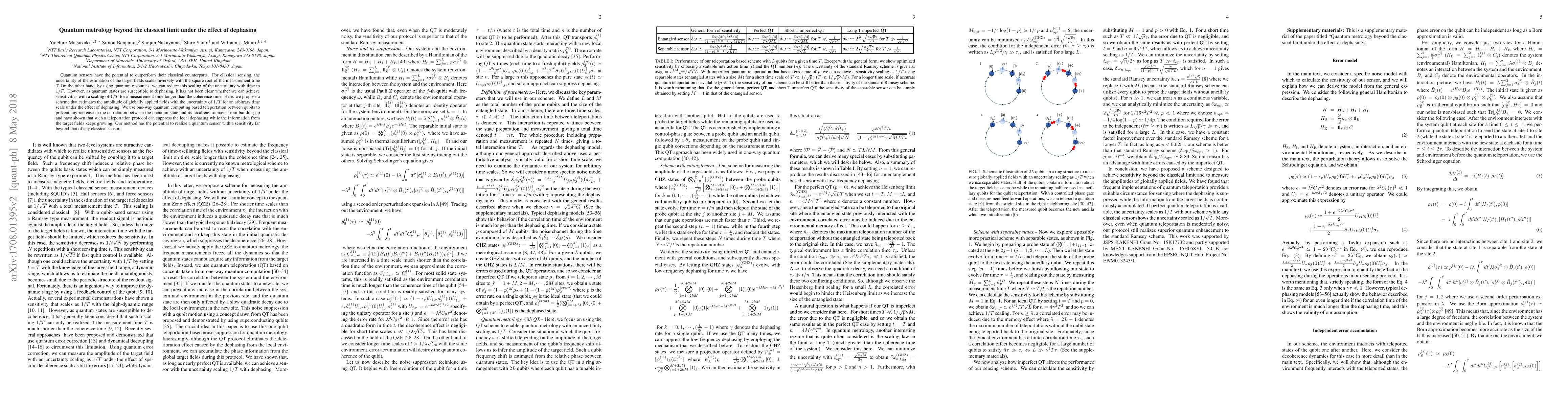 Quantum sensors have the potential to outperform their classical counterparts. For classical sensing, the uncertainty of the estimation of the target fields scales inversely with the square root of the measurement time T. On the other hand, by using quantum resources, we can reduce this scaling of the uncertainty with time to 1/T. However, as quantum states are susceptible to dephasing, it has not been clear whether we can achieve sensitivities with a scaling of 1/T for a measurement time longer than the coherence time. Here, we propose a scheme that estimates the amplitude of globally applied fields with the uncertainty of 1/T for an arbitrary time scale under the effect of dephasing. We use one-way quantum computing based teleportation between qubits to prevent any increase in the correlation between the quantum state and its local environment from building up and have shown that such a teleportation protocol can suppress the local dephasing while the information from the target fields keeps growing. Our method has the potential to realize a quantum sensor with a sensitivity far beyond that of any classical sensor.