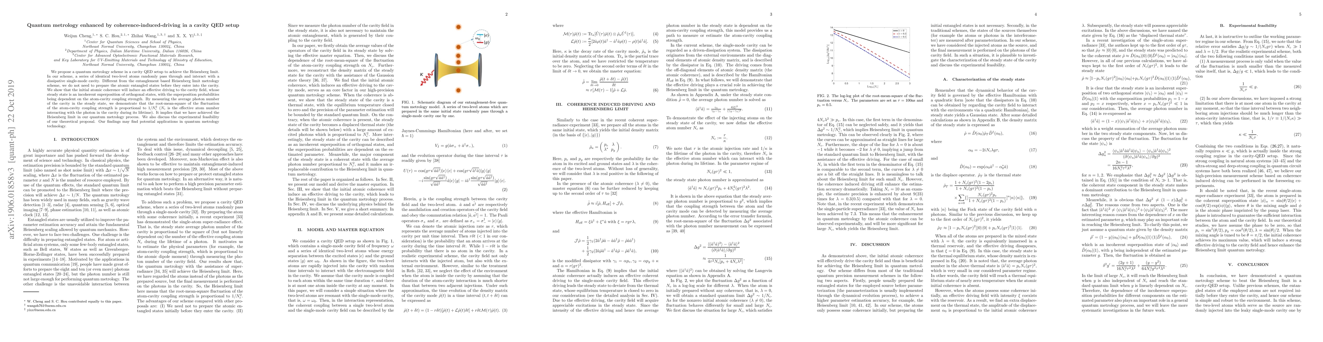 This paper proposes a quantum metrology scheme in a cavity QED setup that achieves the Heisenberg limit without requiring pre-entangled atomic states. It uses initial atomic coherence to induce effective driving in the cavity, reaching the Heisenberg limit through the measurement of average photon number in the steady state.