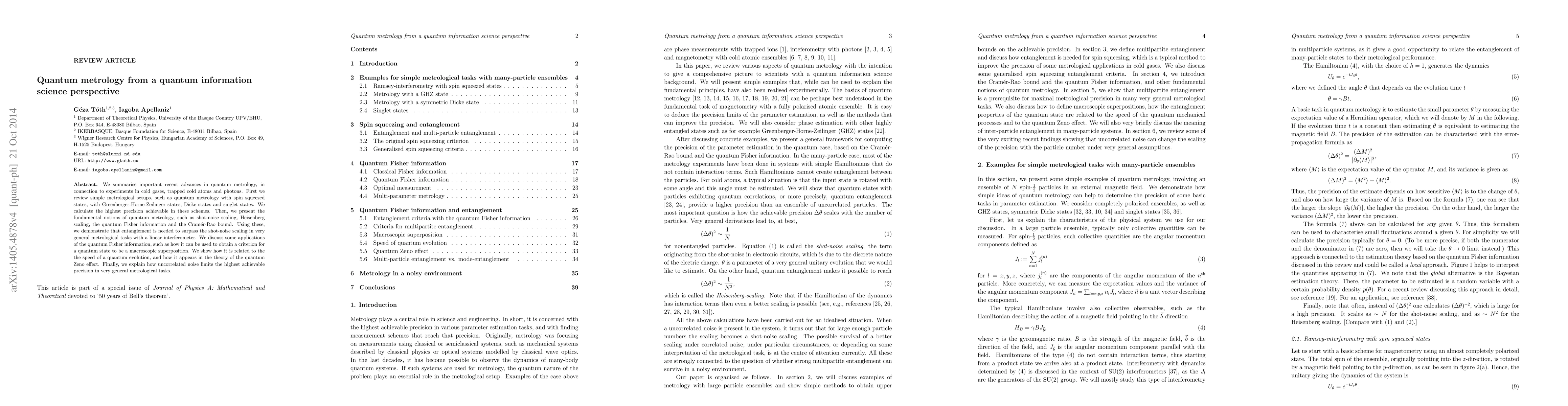This paper reviews recent advances in quantum metrology, focusing on setups using spin squeezed states, Greenberger-Horne-Zeilinger states, and others. It discusses the fundamental principles of quantum metrology, including the quantum Fisher information and its role in surpassing shot-noise limits, and explores its applications in determining macroscopic superpositions and quantum evolution speeds.