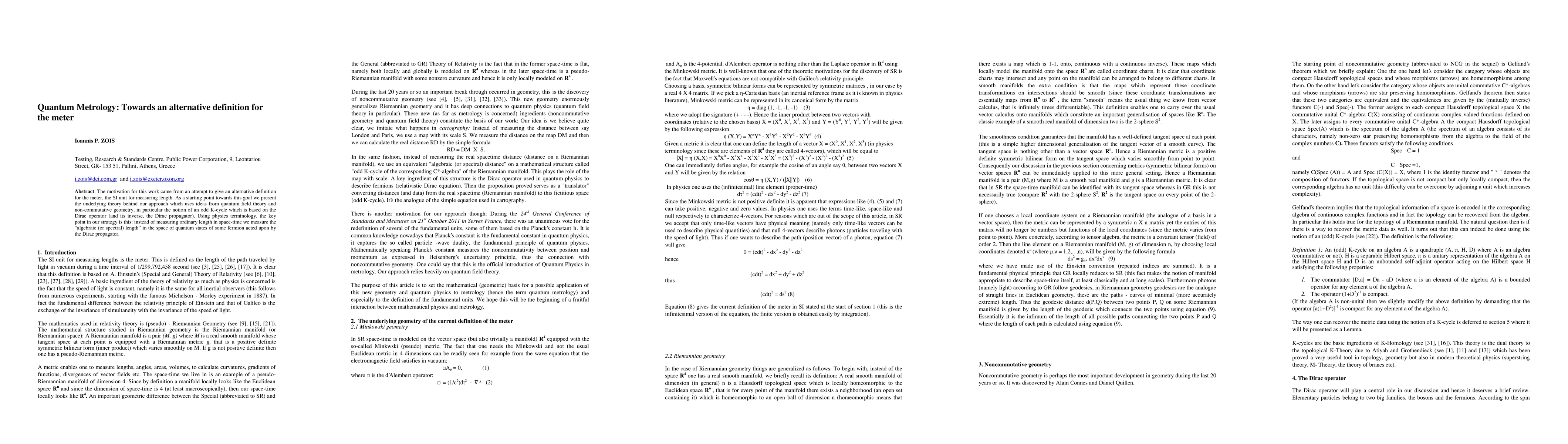The motivation for this article came from an attempt to give an alternative definition for the meter, the SI unit for measuring length. As a starting point towards this goal, in this piece of work we present the underlying theory behind our approach which uses ideas from quantum field theory and noncommutative geometry, in particular the notion of an odd K-cycle which is based on the Dirac operator (and its inverse, the Dirac propagator). Using (the perhaps more familiar) physics terminology, the key point in our strategy is this: instead of measuring length directly in space-time we measure the "algebraic (spectral) length" in the space of the corresponding quantum states of some particle (fermion) acted upon by the Dirac propagator. This approach shares the spirit of the unanimus vote of the 24th General Conference of Standards and Measures (21st October 2011) in Serves, France for the redefinition of the fundamental units using Planck's constant.