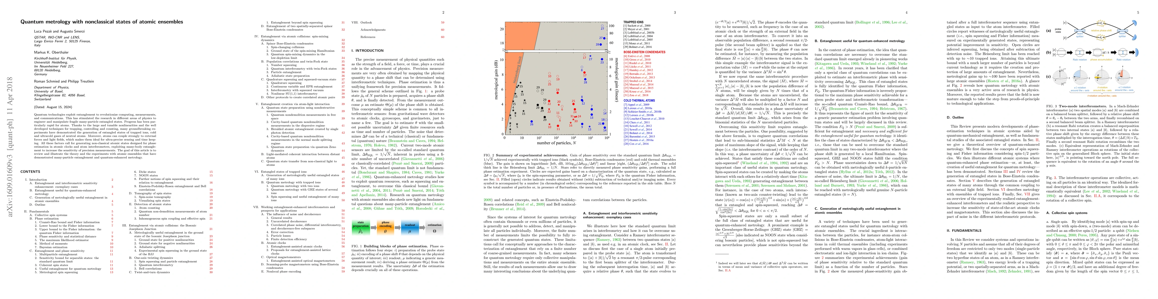 Quantum technologies exploit entanglement to revolutionize computing, measurements, and communications. This has stimulated the research in different areas of physics to engineer and manipulate fragile many-particle entangled states. Progress has been particularly rapid for atoms. Thanks to the large and tunable nonlinearities and the well developed techniques for trapping, controlling and counting, many groundbreaking experiments have demonstrated the generation of entangled states of trapped ions, cold and ultracold gases of neutral atoms. Moreover, atoms can couple strongly to external forces and light fields, which makes them ideal for ultra-precise sensing and time keeping. All these factors call for generating non-classical atomic states designed for phase estimation in atomic clocks and atom interferometers, exploiting many-body entanglement to increase the sensitivity of precision measurements. The goal of this article is to review and illustrate the theory and the experiments with atomic ensembles that have demonstrated many-particle entanglement and quantum-enhanced metrology.