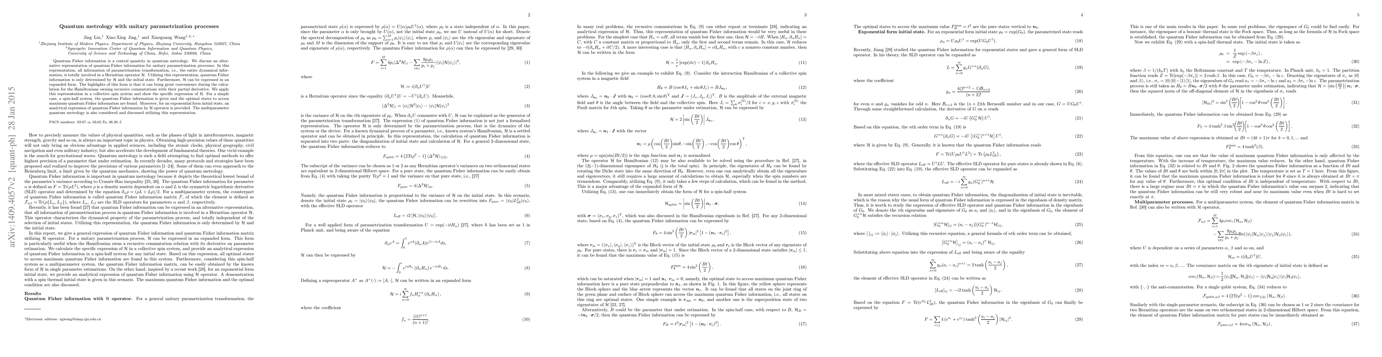 This paper proposes an alternative representation of quantum Fisher information for unitary parametrization processes, where all dynamical information is encapsulated in a Hermitian operator H. This representation simplifies the analysis of quantum metrology in systems like collective spin systems, providing specific expressions for H and optimal states for maximum quantum Fisher information.