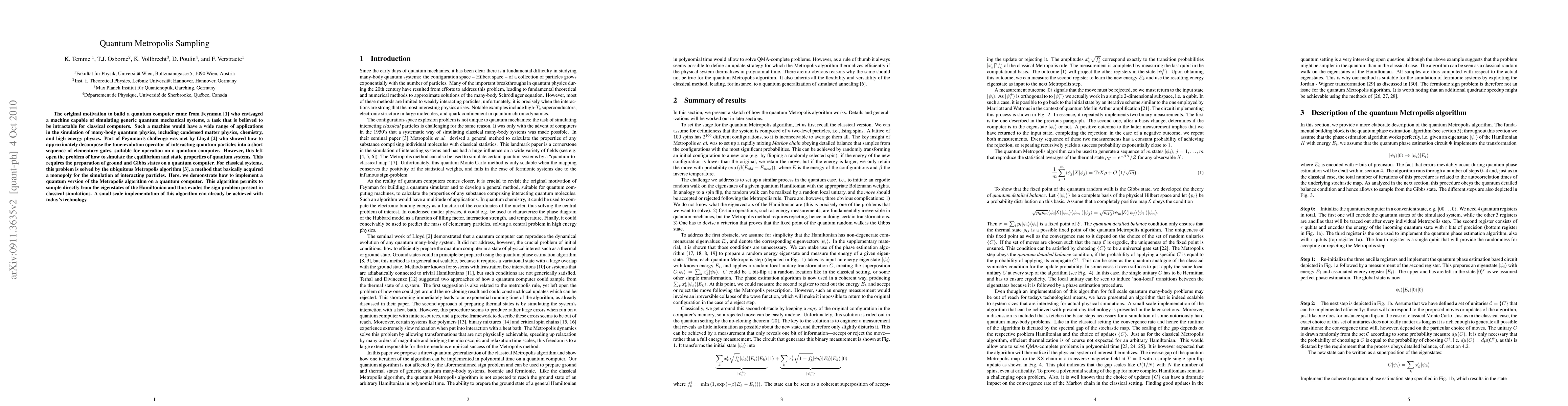 The original motivation to build a quantum computer came from Feynman who envisaged a machine capable of simulating generic quantum mechanical systems, a task that is believed to be intractable for classical computers. Such a machine would have a wide range of applications in the simulation of many-body quantum physics, including condensed matter physics, chemistry, and high energy physics. Part of Feynman's challenge was met by Lloyd who showed how to approximately decompose the time-evolution operator of interacting quantum particles into a short sequence of elementary gates, suitable for operation on a quantum computer. However, this left open the problem of how to simulate the equilibrium and static properties of quantum systems. This requires the preparation of ground and Gibbs states on a quantum computer. For classical systems, this problem is solved by the ubiquitous Metropolis algorithm, a method that basically acquired a monopoly for the simulation of interacting particles. Here, we demonstrate how to implement a quantum version of the Metropolis algorithm on a quantum computer. This algorithm permits to sample directly from the eigenstates of the Hamiltonian and thus evades the sign problem present in classical simulations. A small scale implementation of this algorithm can already be achieved with today's technology
