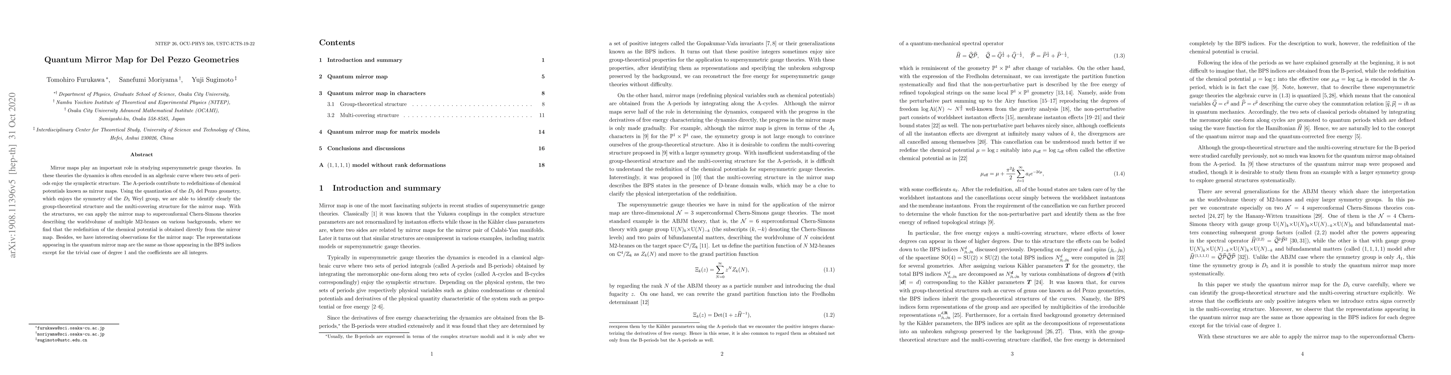 Mirror maps play an important role in studying supersymmetric gauge theories. In these theories the dynamics is often encoded in an algebraic curve where two sets of periods enjoy the symplectic structure. The A-periods contribute to redefinitions of chemical potentials known as mirror maps. Using the quantization of the $D_5$ del Pezzo geometry, which enjoys the symmetry of the $D_5$ Weyl group, we are able to identify clearly the group-theoretical structure and the multi-covering structure for the mirror map. With the structures, we can apply the mirror map to superconformal Chern-Simons theories describing the worldvolume of multiple M2-branes on various backgrounds, where we find that the redefinition of the chemical potential is obtained directly from the mirror map. Besides, we have interesting observations for the mirror map: The representations appearing in the quantum mirror map are the same as those appearing in the BPS indices except for the trivial case of degree 1 and the coefficients are all integers.