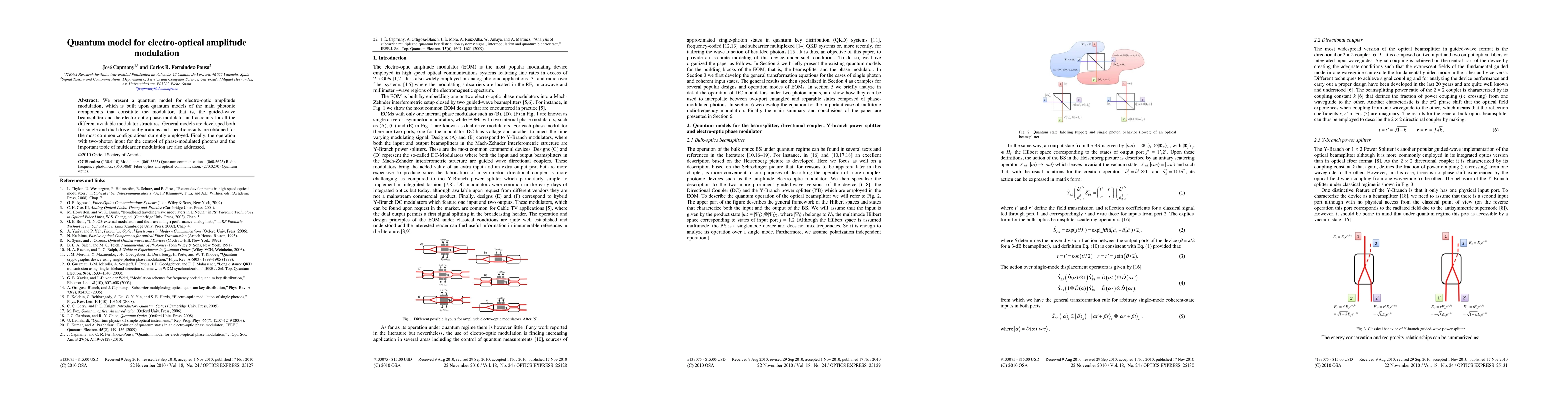 We present a quantum model for electro-optic amplitude modulation, which is built upon quantum models of the main photonic components that constitute the modulator, that is, the guided-wave beamsplitter and the electro-optic phase modulator and accounts for all the different available modulator structures. General models are developed both for single and dual drive configurations and specific results are obtained for the most common configurations currently employed. Finally, the operation with two-photon input for the control of phase-modulated photons and the important topic of multicarrier modulation are also addressed.
