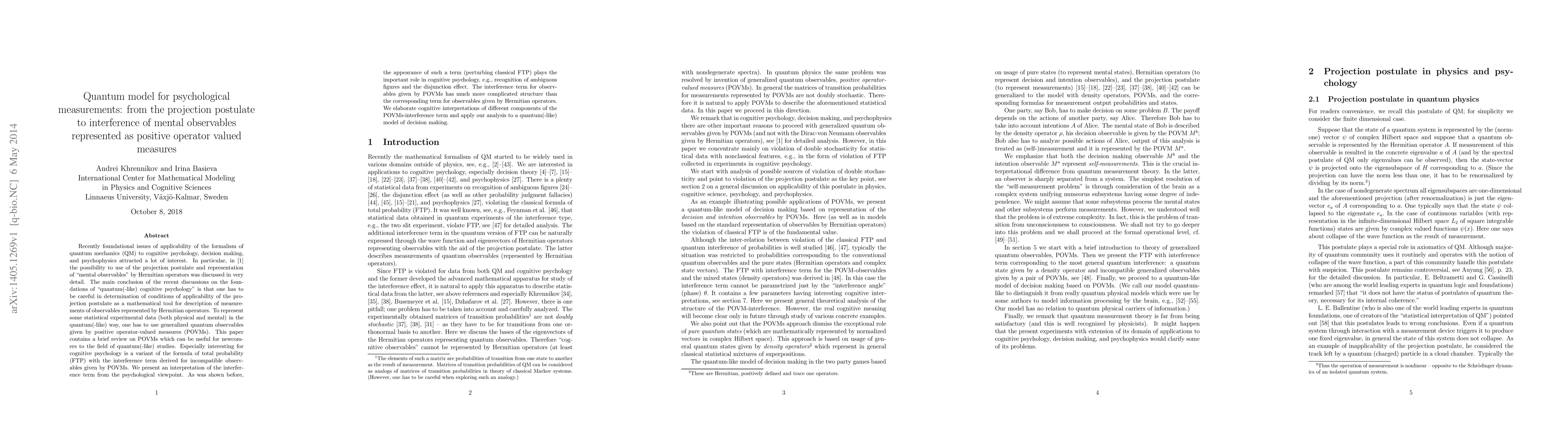 Recently foundational issues of applicability of the formalism of quantum mechanics (QM) to cognitive psychology, decision making, and psychophysics attracted a lot of interest. In particular, in \cite{DKBB} the possibility to use of the projection postulate and representation of "mental observables" by Hermitian operators was discussed in very detail. The main conclusion of the recent discussions on the foundations of "quantum(-like) cognitive psychology" is that one has to be careful in determination of conditions of applicability of the projection postulate as a mathematical tool for description of measurements of observables represented by Hermitian operators. To represent some statistical experimental data (both physical and mental) in the quantum(-like) way, one has to use generalized quantum observables given by positive operator-valued measures (POVMs). This paper contains a brief review on POVMs which can be useful for newcomers to the field of quantum(-like) studies. Especially interesting for cognitive psychology is a variant of the formula of total probability (FTP) with the interference term derived for incompatible observables given by POVMs. We present an interpretation of the interference term from the psychological viewpoint. As was shown before, the appearance of such a term (perturbing classical FTP) plays the important role in cognitive psychology, e.g., recognition of ambiguous figures and the disjunction effect. The interference term for observables given by POVMs has much more complicated structure than the corresponding term for observables given by Hermitian operators. We elaborate cognitive interpretations of different components of the POVMs-interference term and apply our analysis to a quantum(-like) model of decision making.