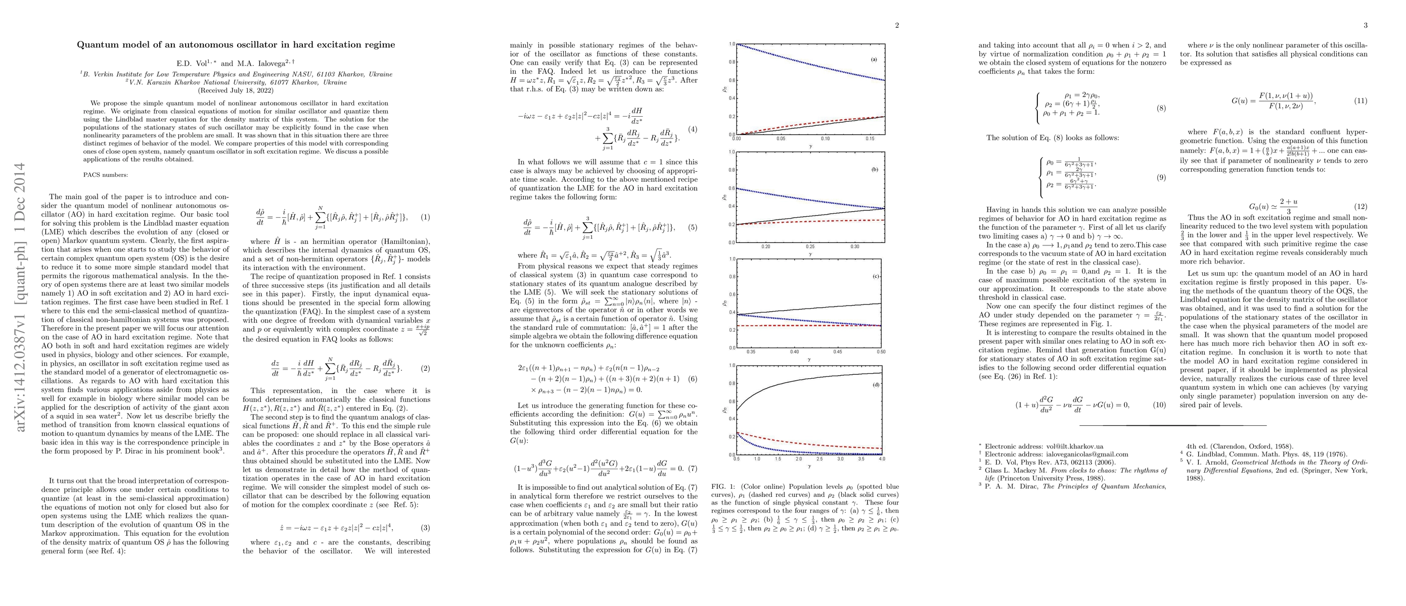 We propose the simple quantum model of nonlinear autonomous oscillator in hard excitation regime. We originate from classical equations of motion for similar oscillator and quantize them using the Lindblad master equation for the density matrix of this system. The solution for the populations of the stationary states of such oscillator may be explicitly found in the case when nonlinearity parameters of the problem are small. It was shown that in this situation there are three distinct regimes of behavior of the model. We compare properties of this model with corresponding ones of close open system, namely quantum oscillator in soft excitation regime. We discuss a possible applications of the results obtained.
