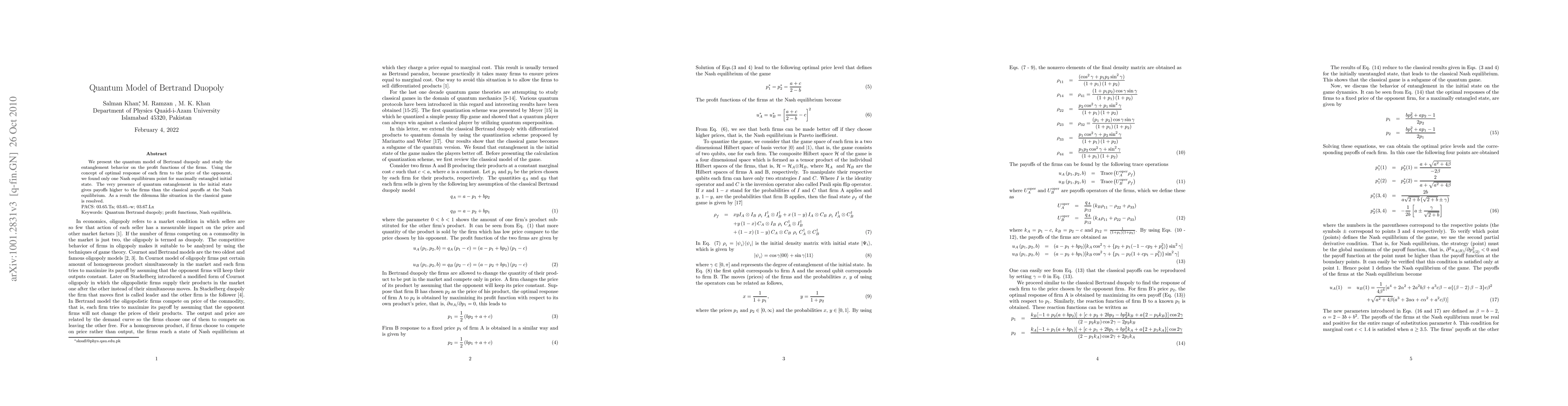 Researchers developed a quantum model of Bertrand duopoly and found that entanglement in initial states can improve profit outcomes for firms, resolving a classic dilemma-like situation.