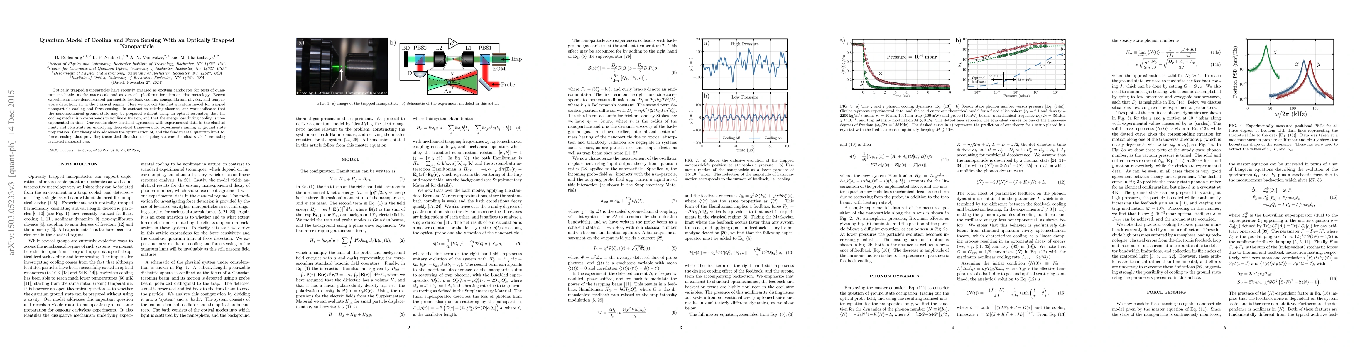 This paper presents a quantum model for cooling and force sensing of optically trapped nanoparticles, demonstrating that ground state preparation can occur without an optical resonator and that cooling involves nonlinear friction. The model also reveals nonexponential energy loss and provides a theoretical framework for optimizing force sensing in ultrasensitive metrology experiments.