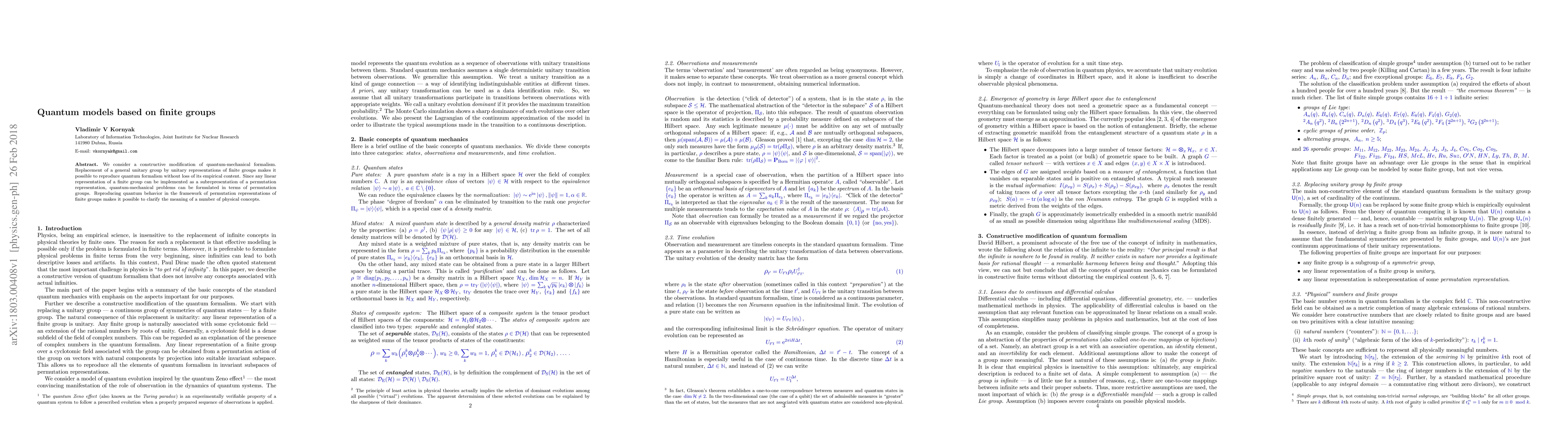The paper proposes a constructive modification of quantum-mechanical formalism by replacing the general unitary group with unitary representations of finite groups, allowing quantum behavior to be reproduced without losing empirical content. It also discusses the implementation of quantum-mechanical problems in terms of permutation representations of finite groups.