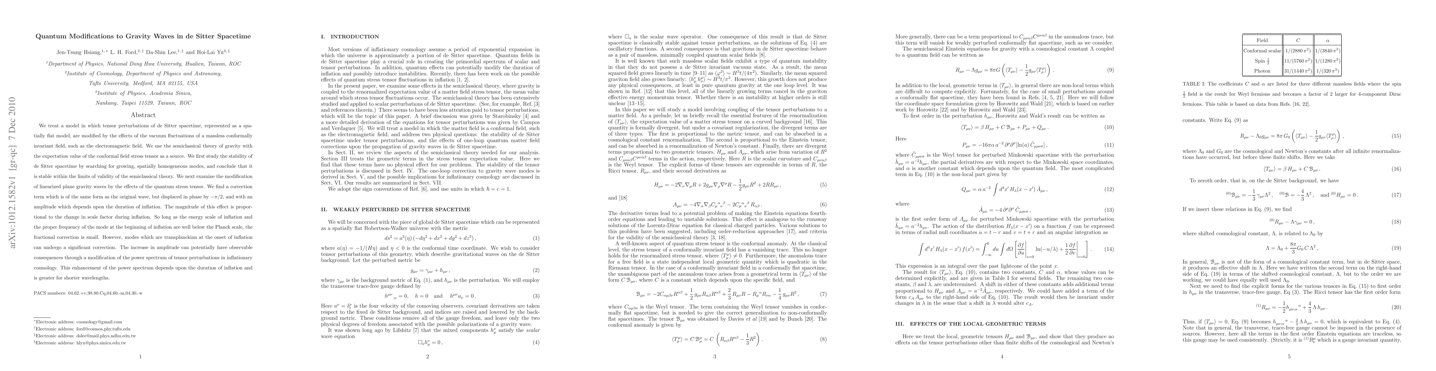 This paper investigates quantum modifications to gravity waves in de Sitter spacetime, showing that tensor perturbations are altered by vacuum fluctuations of a massless conformal field. It finds that while the de Sitter spacetime is stable, gravity waves undergo a phase shift and amplitude correction proportional to the inflation scale factor, with significant effects for transplanckian modes potentially affecting the inflationary tensor perturbations' power spectrum.