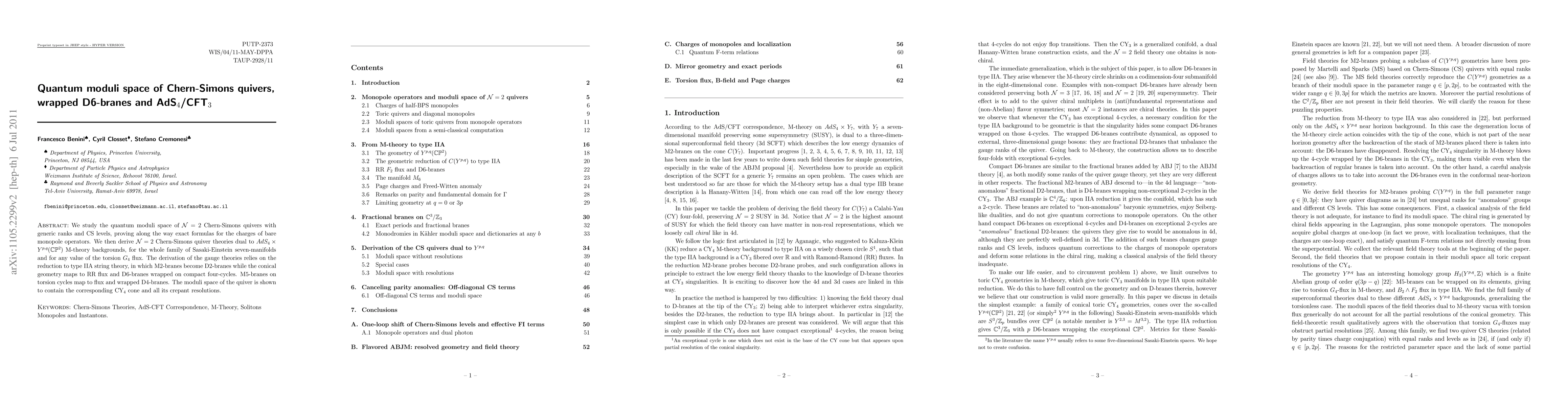 Summary: The paper examines the quantum moduli space of N=2 Chern-Simons quivers, deriving exact formulas for monopole operator charges and linking these theories to dual AdS_4 x Y^{p,q}(CP2) M-theory backgrounds, through the reduction to type IIA string theory involving wrapped D6-branes and flux.