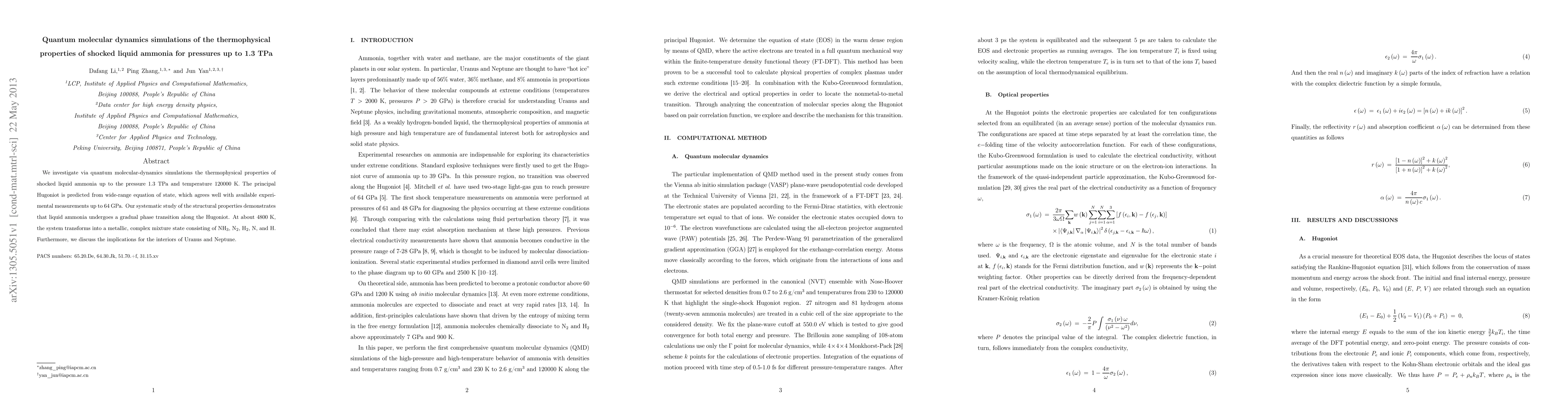 This study uses quantum molecular-dynamics simulations to investigate the thermophysical properties of shocked liquid ammonia under extreme pressures up to 1.3 TPa and temperature 120000 K, revealing a gradual phase transition into a metallic mixture state at around 4800 K. The findings align well with experimental data and have implications for understanding the interiors of Uranus and Neptune.