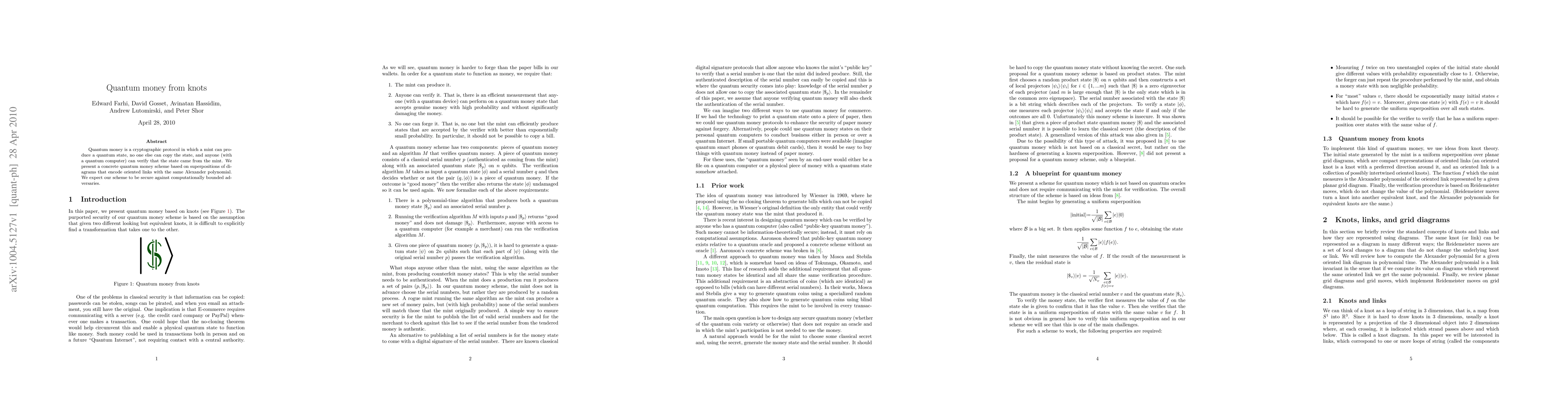 This paper proposes a quantum money scheme using superpositions of diagrams encoding oriented links with identical Alexander polynomials. The scheme is designed to be secure against adversaries with limited computational power.