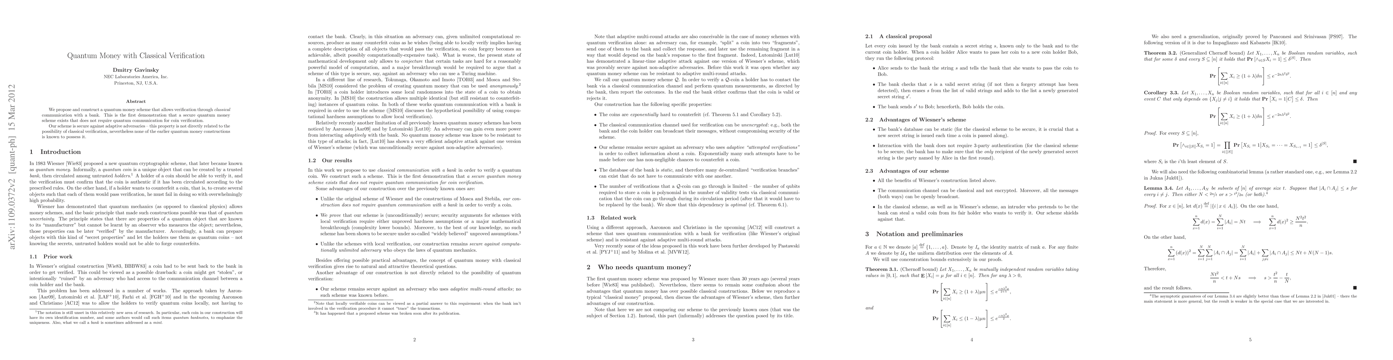 This paper introduces a novel quantum money scheme that can be verified through classical communication, marking the first instance of secure quantum money without requiring quantum verification. The proposed scheme is secure against adaptive adversaries, a significant advancement over previous quantum money constructions.