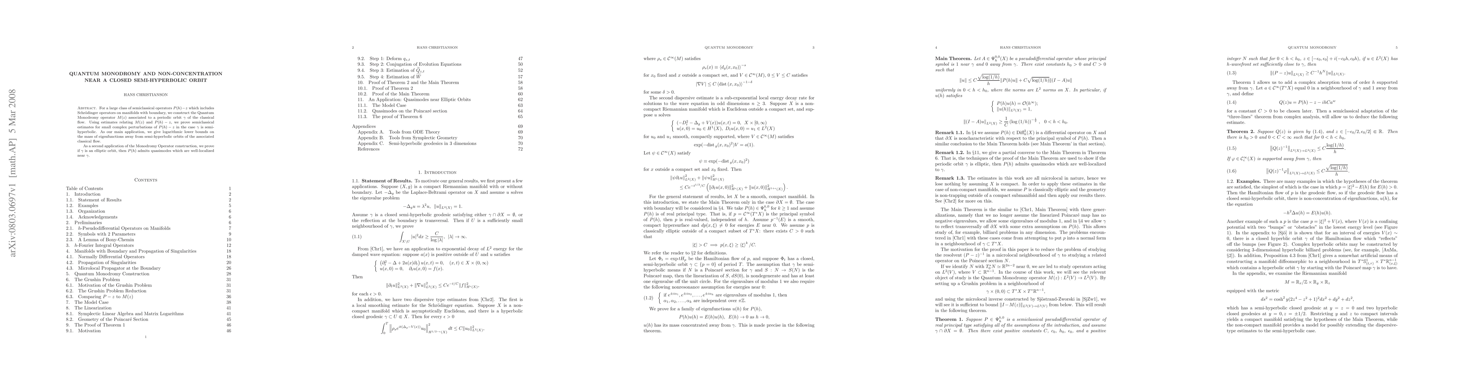This paper constructs a Quantum Monodromy operator for semiclassical operators, proving semiclassical estimates for perturbations near semi-hyperbolic orbits and providing logarithmic lower bounds on eigenfunction mass away from such orbits. It also shows that elliptic orbits lead to quasimodes well-localized near them.