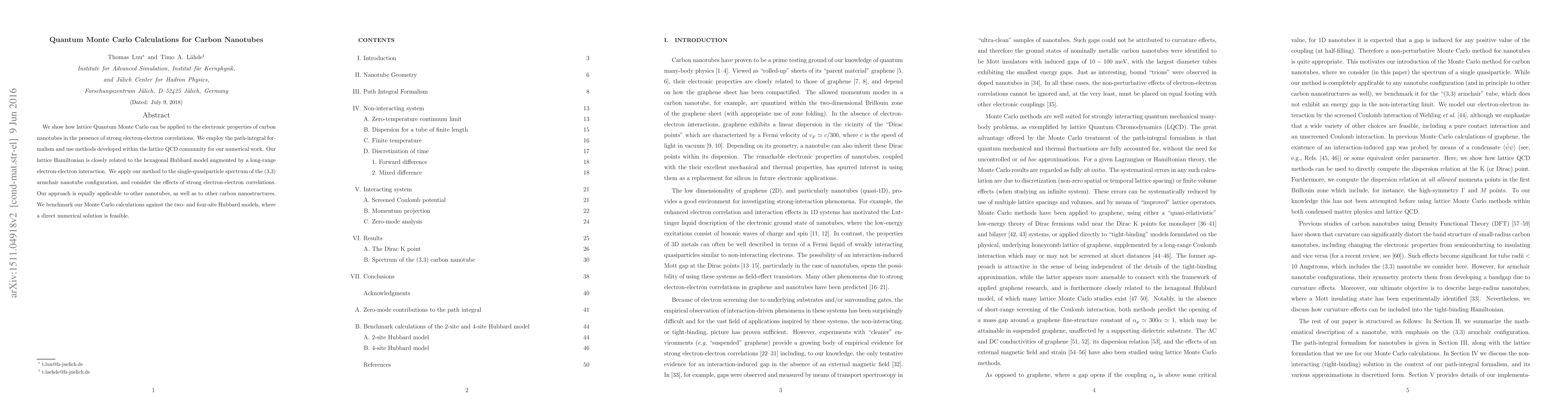 This paper applies lattice Quantum Monte Carlo to study the electronic properties of carbon nanotubes under strong electron-electron correlations, utilizing the path-integral formalism and methods from lattice QCD. The study focuses on the (3,3) armchair nanotube and demonstrates the method's applicability to other nanotubes and carbon structures.