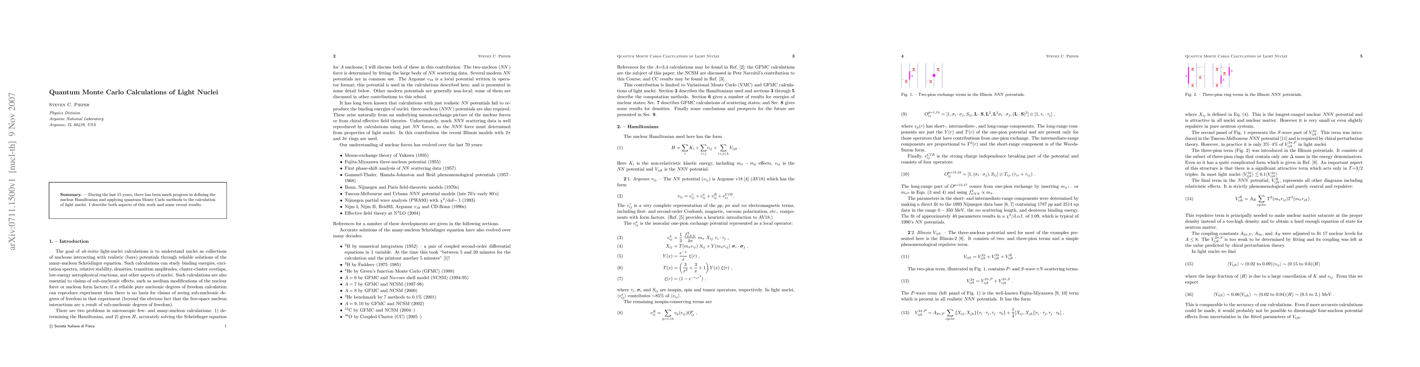 During the last 15 years, there has been much progress in defining the nuclear Hamiltonian and applying quantum Monte Carlo methods to the calculation of light nuclei. I describe both aspects of this work and some recent results.
