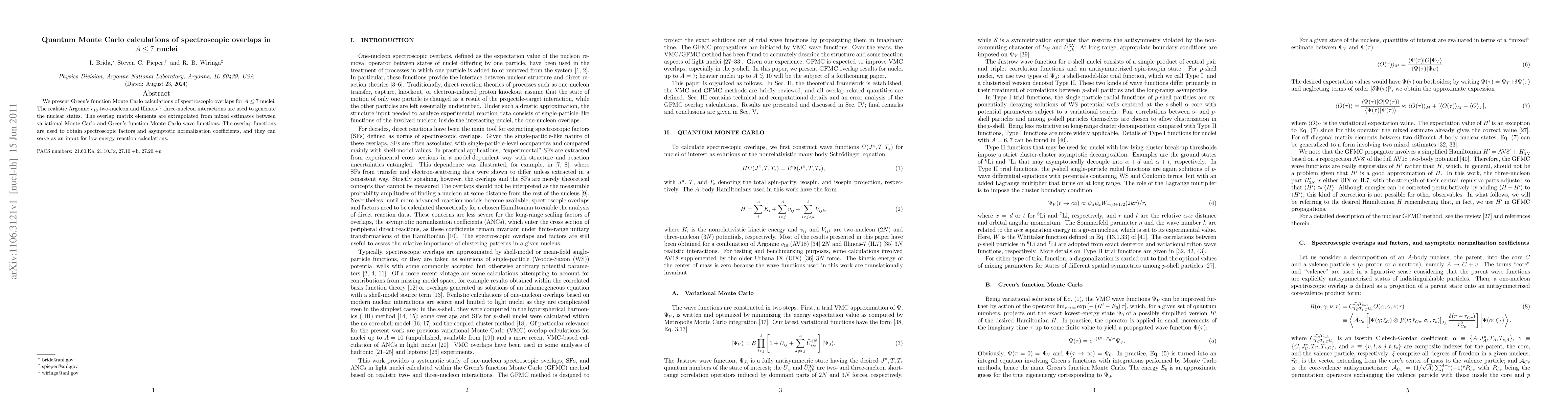 This paper reports Green's function Monte Carlo calculations of spectroscopic overlaps for light nuclei ($A \leq 7$) using realistic nucleon-nucleon and three-nucleon interactions. The results provide spectroscopic factors and normalization coefficients, useful for low-energy nuclear reaction studies.