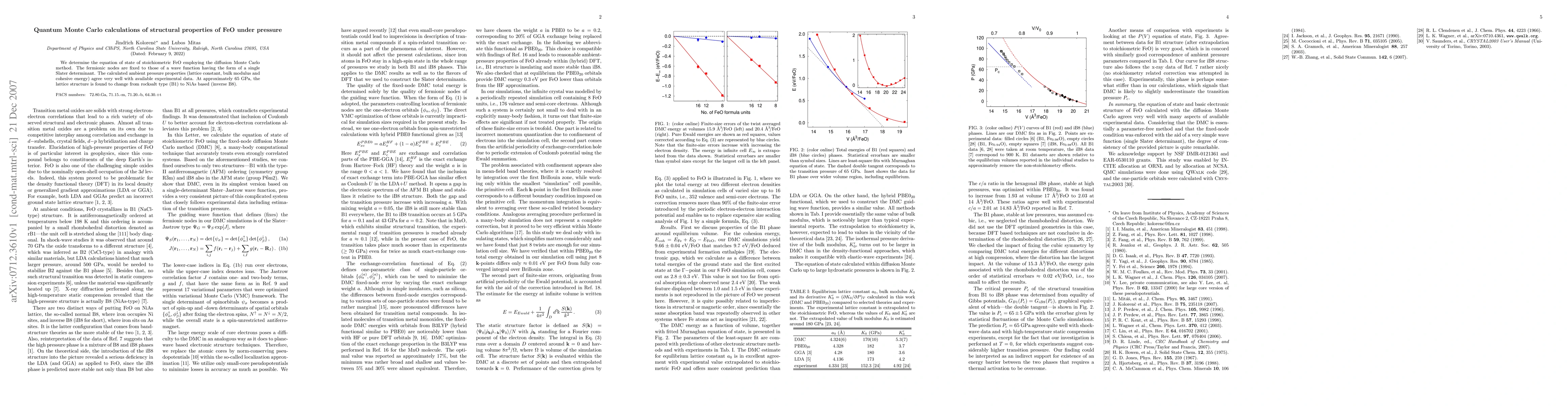 The research uses the diffusion Monte Carlo method to calculate FeO's equation of state, accurately replicating its ambient pressure properties. At around 65 GPa, a structural shift from rocksalt to NiAs-based is identified.