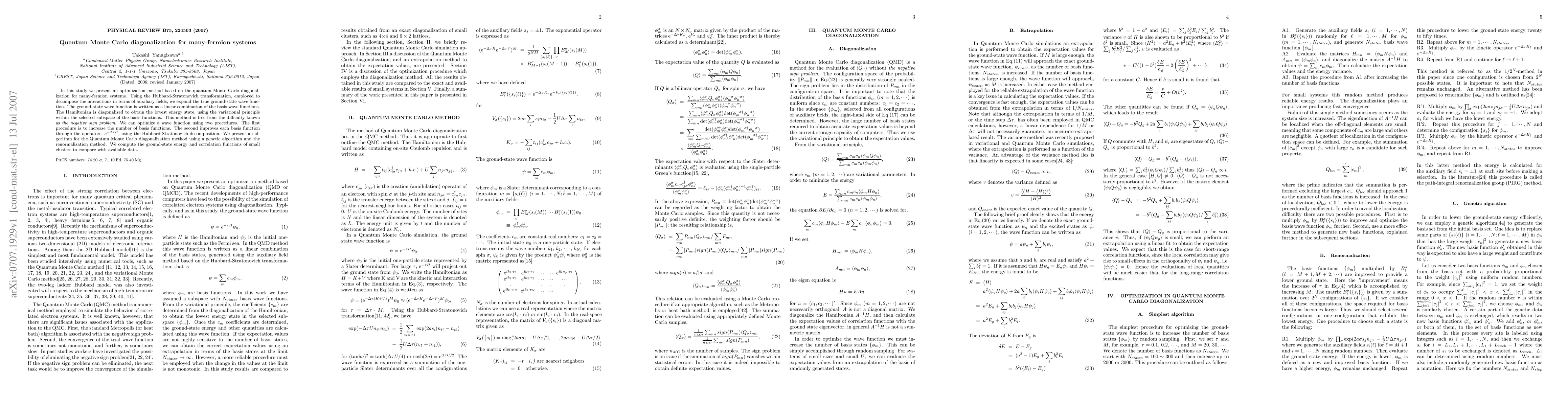 This paper introduces an optimized Quantum Monte Carlo diagonalization method for many-fermion systems, leveraging the Hubbard-Stratonovich transformation to avoid the negative sign problem. The method optimizes the ground-state wave function using a genetic algorithm and renormalization, and computes ground-state energies and correlation functions for small clusters.
