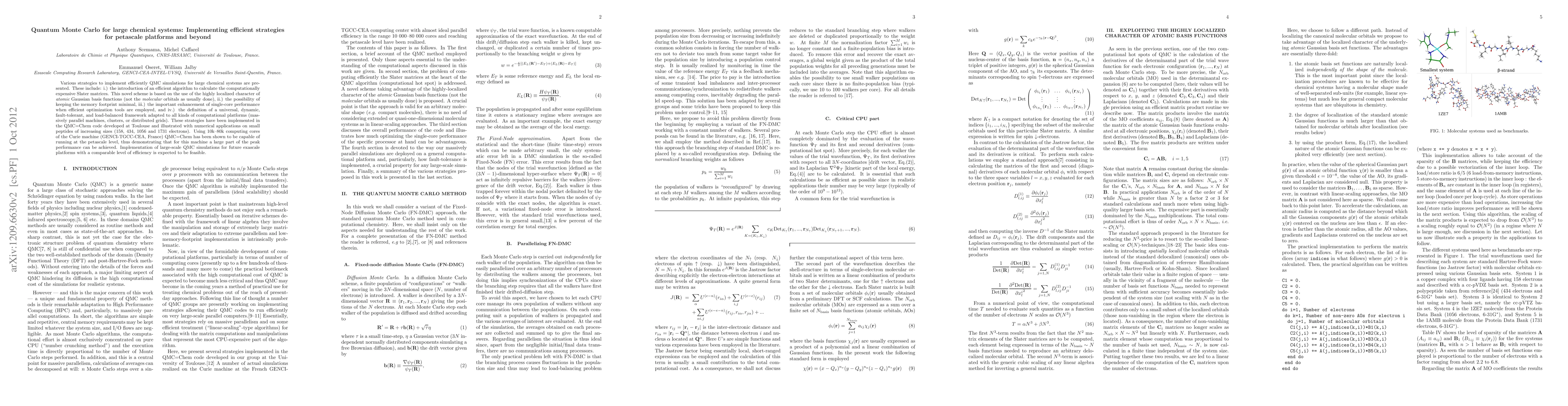 This paper presents efficient strategies for implementing Quantum Monte Carlo (QMC) simulations on large chemical systems, including a novel algorithm for Slater matrices, minimal memory usage, enhanced single-core performance, and a universal computational framework adaptable to various platforms. The QMC=Chem code was tested on small peptides, demonstrating petascale performance on the Curie machine.
